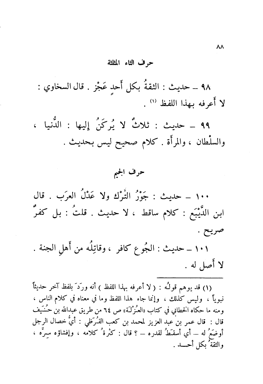 98 - حَدِيثُ الثِّقَةُ بِكُلِّ أَحَدٍ عَجْزٌ قَالَ السَّخَاوِيُّ لَا أَعْرِفُهُ بِهَذَا اللَّفْظِ