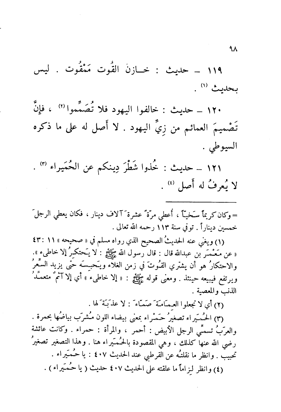 120 - حَدِيثُ خَالِفُوا الْيَهُودَ فَلا تُصَمِّمُوا فَإِنَّ تَصْمِيمَ الْعَمَائِمِ مِنْ زِيِّ الْيَهُودِ لَا أَصْلَ لَهُ عَلَى مَا ذَكَرَهُ السُّيُوطِيُّ