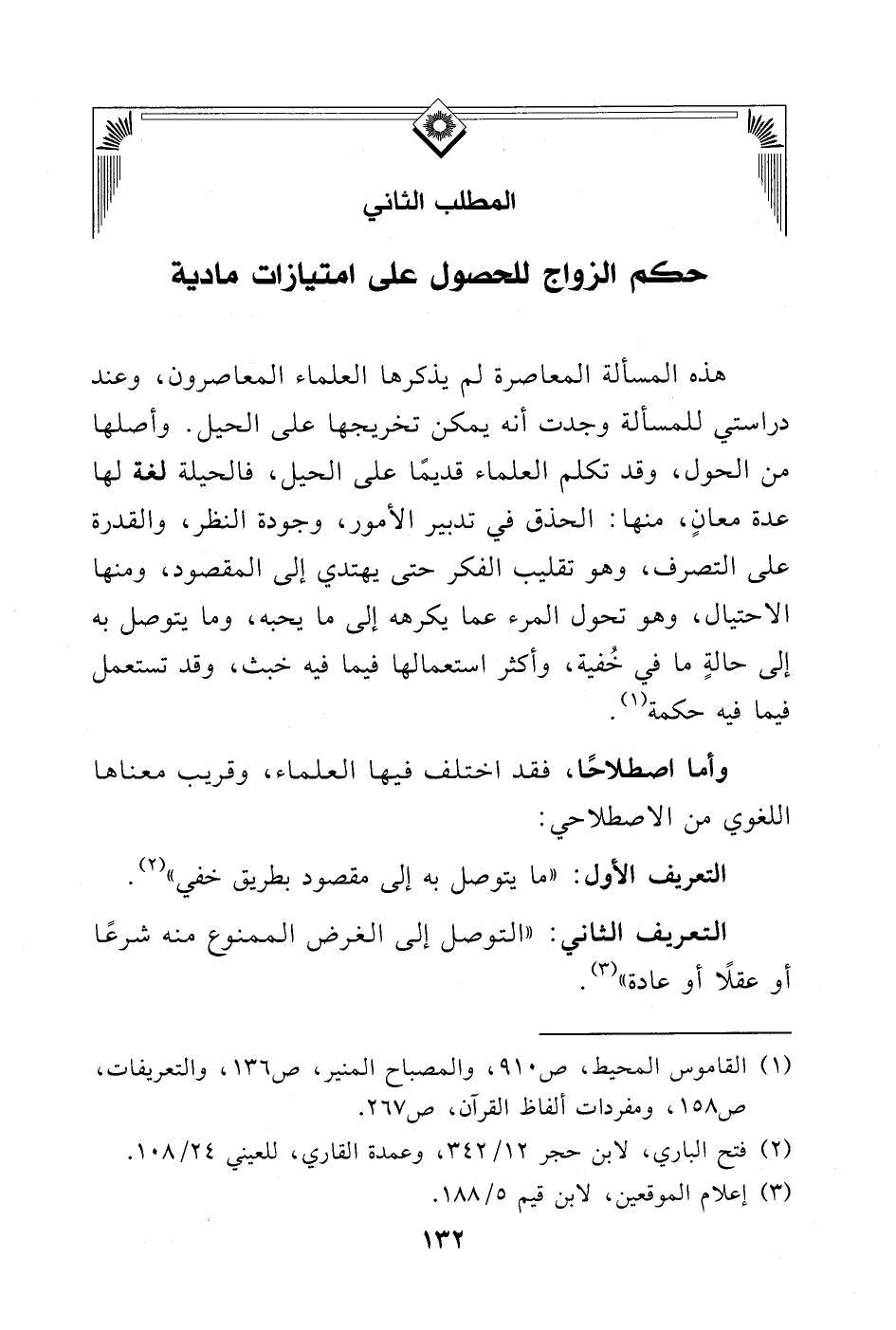 التعريف الثاني: «التوصل إلى الغرض الممنوع منه شرعًا أو عقلاً أو عادة» (¬3).