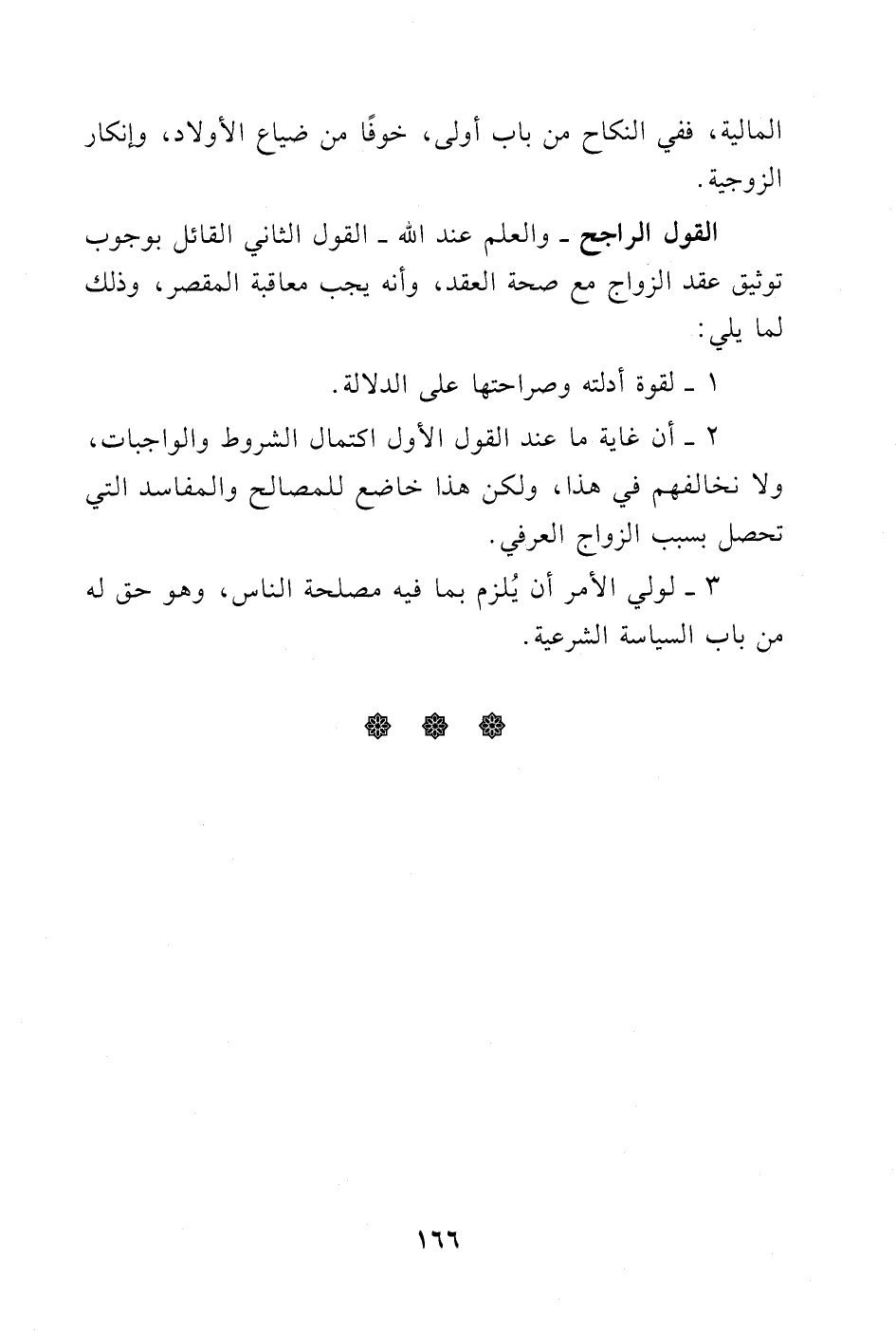 2 - أن غاية ما عند القول الأول اكتمال الشروط والواجبات، ولا نخالفهم في هذا، ولكن هذا خاضع للمصالح والمفاسد التي تحصل بسبب الزواج العرفي.