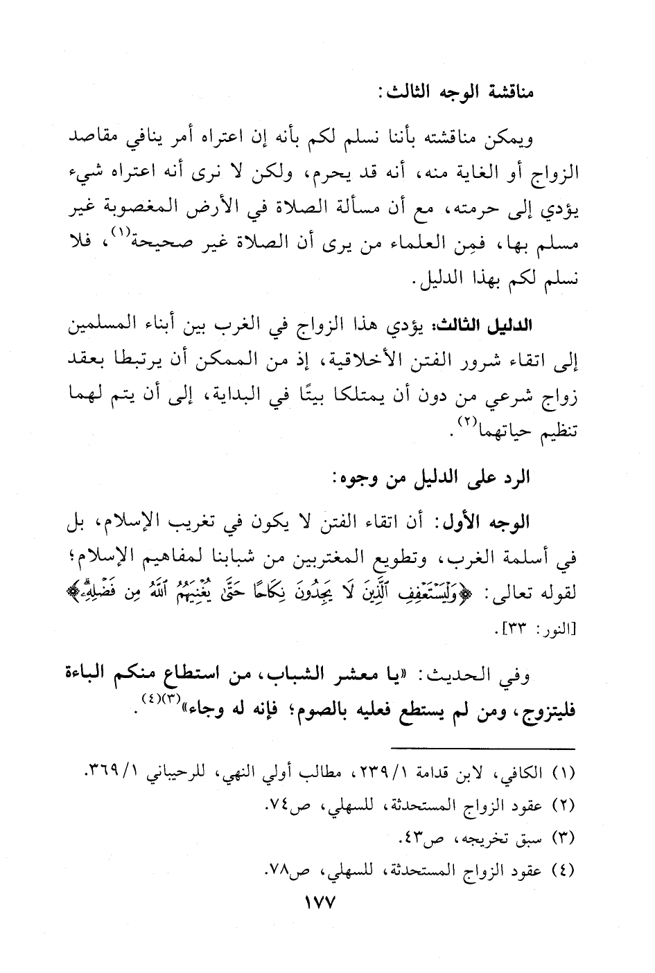 الوجه الأول: أن اتقاء الفتن لا يكون في تغريب الإسلام، بل في أسلمة الغرب، وتطويع المغتربين من شبابنا لمفاهيم الإسلام؛ لقوله تعالى: {وَلْيَسْتَعْفِفِ الَّذِينَ لَا يَجِدُونَ نِكَاحًا حَتَّى يُغْنِيَهُمُ اللَّهُ مِنْ فَضْلِهِ} (¬3).