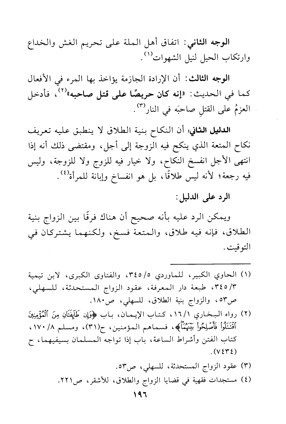 (¬1) الحاوي الكبير، للماوردي (5/ 345)، والفتاوى الكبرى، لابن تيمية (3/ 345)، طبعة دار المعرفة، وعقود الزواج المستحدثة، للسهلي، ص 53، والزواج بنية الطلاق، للسهلي، ص 180.
