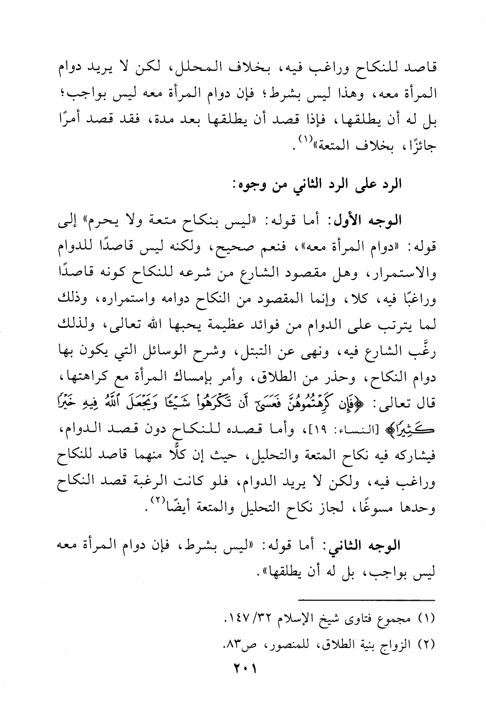 الوجه الأول: أما قوله: "ليس بنكاح متعة ولا يحرم" إلى قوله "دوام المرأة معه"، فنعم صحيح، ولكنه ليس قاصدًا للدوام والاستمرار، وهل مقصود الشارع من شرعه للنكاح كونه قاصدًا وراغبًا فيه، كلا، وإنما المقصود من النكاح دوامه واستمراره، وذلك لما يترتب على الدوام من فوائد عظيمة يحبها الله تعالى، ولذلك رغب الشارع فيه، ونهى عن التبتل، وشرح الوسائل التي يكون بها دوام النكاح، وحذر من الطلاق، وأمر بإمساك المرأة مع كراهتها، قال تعالى: فَإِنِ كَرِهْتُمُوهُنَّ فَعَسَى أَنْ تَكْرَهُوا شَيْئًا وَيَجْعَلَ اللَّهُ فِيهِ خَيْرًا كَثِيرًا) (¬2)، وأما قصده للنكاح دون قصد الدوام، فيشاركه فيه نكاح المتعة والتحليل، حيث إن كلاًّ منهما قاصد للنكاح وراغب فيه، ولكن لا يريد الدوام، فلو كانت الرغبة قصد النكاح وحدها مسوغًا، لجاز نكاح التحليل والمتعة أيضًا (¬3).