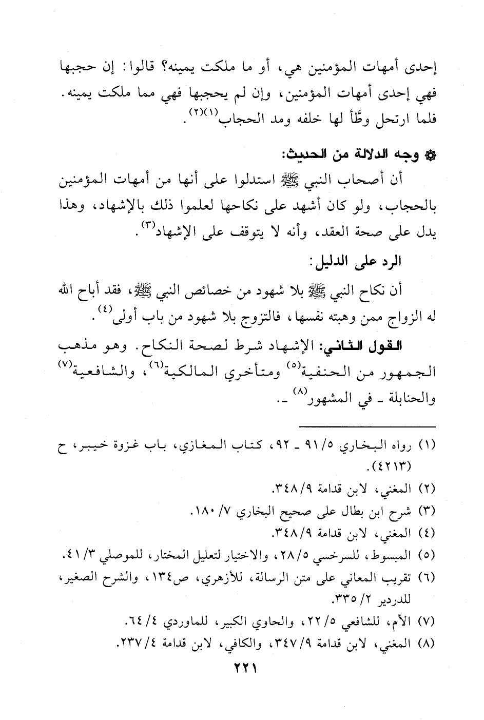 أن أصحاب النبي صلى الله عليه وسلم استدلوا على أنها من أمهات المؤمنين بالحجاب، ولو كان أشهد على نكاحها لعلموا ذلك بالإشهاد، وهذا يدل على صحة العقد، وأنه لا يتوقف على الإشهاد (¬3).