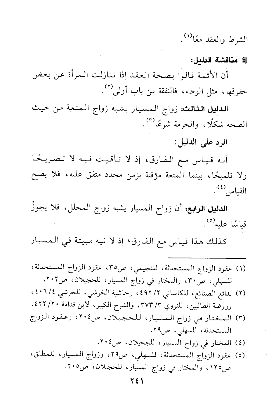 (¬5) عقود الزواج المستجدة، للسهلي، ص 29، وزواج المسيار، للمطلق، ص 125، والمختار في زواج المسيار، للحجيلان، ص 205.