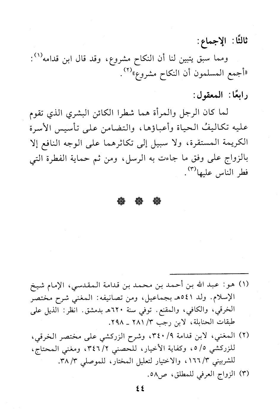 لما كان الرجل والمرأة هما شطرا الكائن البشري الذي تقوم عليه تكاليف الحياة وأعباؤها، والتضامن على تأسيس الأسرة الكريمة المستقرة، ولا سبيل إلى تكاثرهما على الوجه النافع إلا بالزواج على وفق ما جاءت به الرسل، ومن ثم حماية الفطرة التي فطر الناس عليها (¬3).