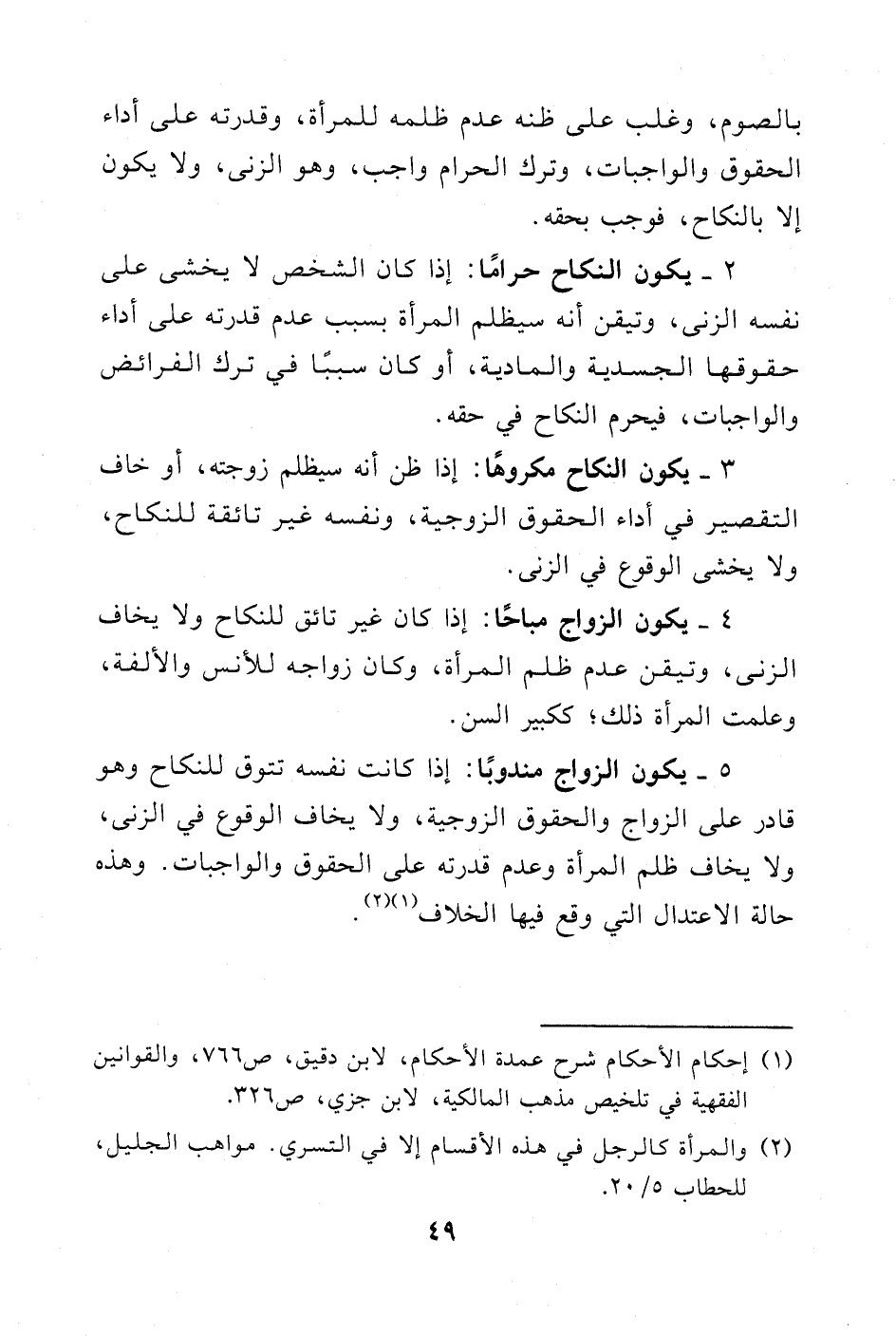 5 - يكون الزواج مندوبًا: إذا كانت نفسه تتوق للنكاح، ولا يخاف الوقوع في الزنى، ولا يخاف ظلم المرأة وعدم قدرته على الحقوق والواجبات. وهذه حالة الاعتدال التي وقع فيها الخلاف (¬1) (¬2).