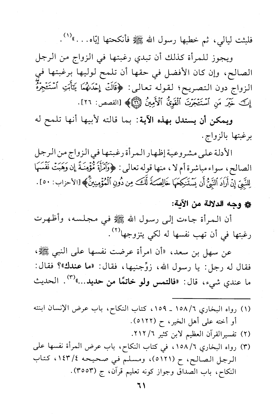 (¬5) رواه البخاري في كتاب النكاح، باب عرض المرأة نفسها على الرجل الصالح (6/ 129)، ح (5121)، ومسلم في صحيحه (4/ 143)، كتاب النكاح، باب الصداق وجواز كونه تعليم قرآن.