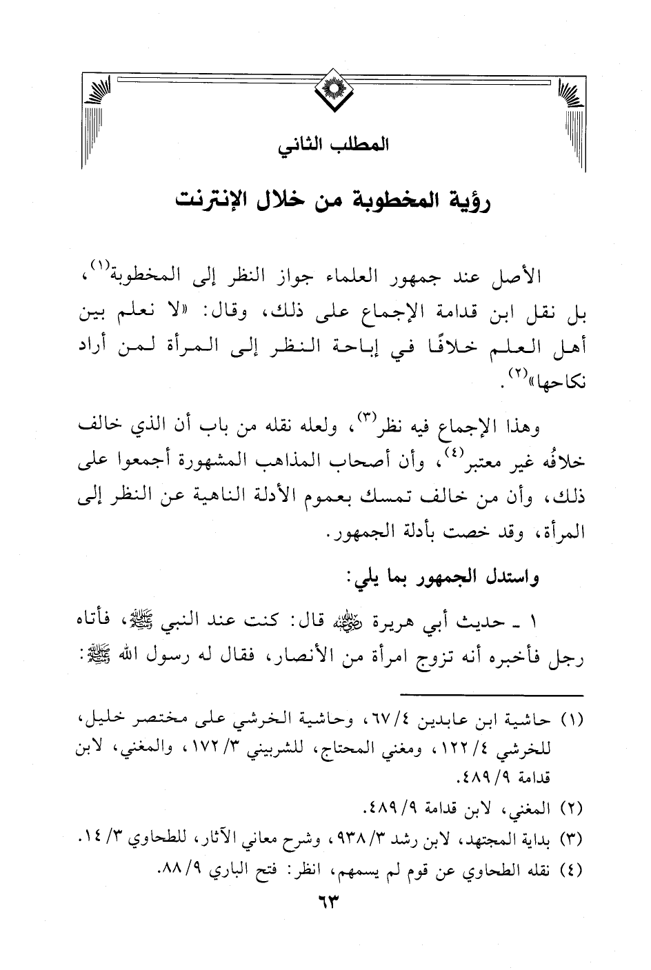 الأصل عند جمهور العلماء جواز النظر إلى المخطوبة (¬1)، بل نقل ابن قدامة الإجماع على ذلك، وقال: «لا نعلم بين أهل العلم خلافًا في إباحة النظر إلى المرأة لمن أراد نكاحها» (¬2).