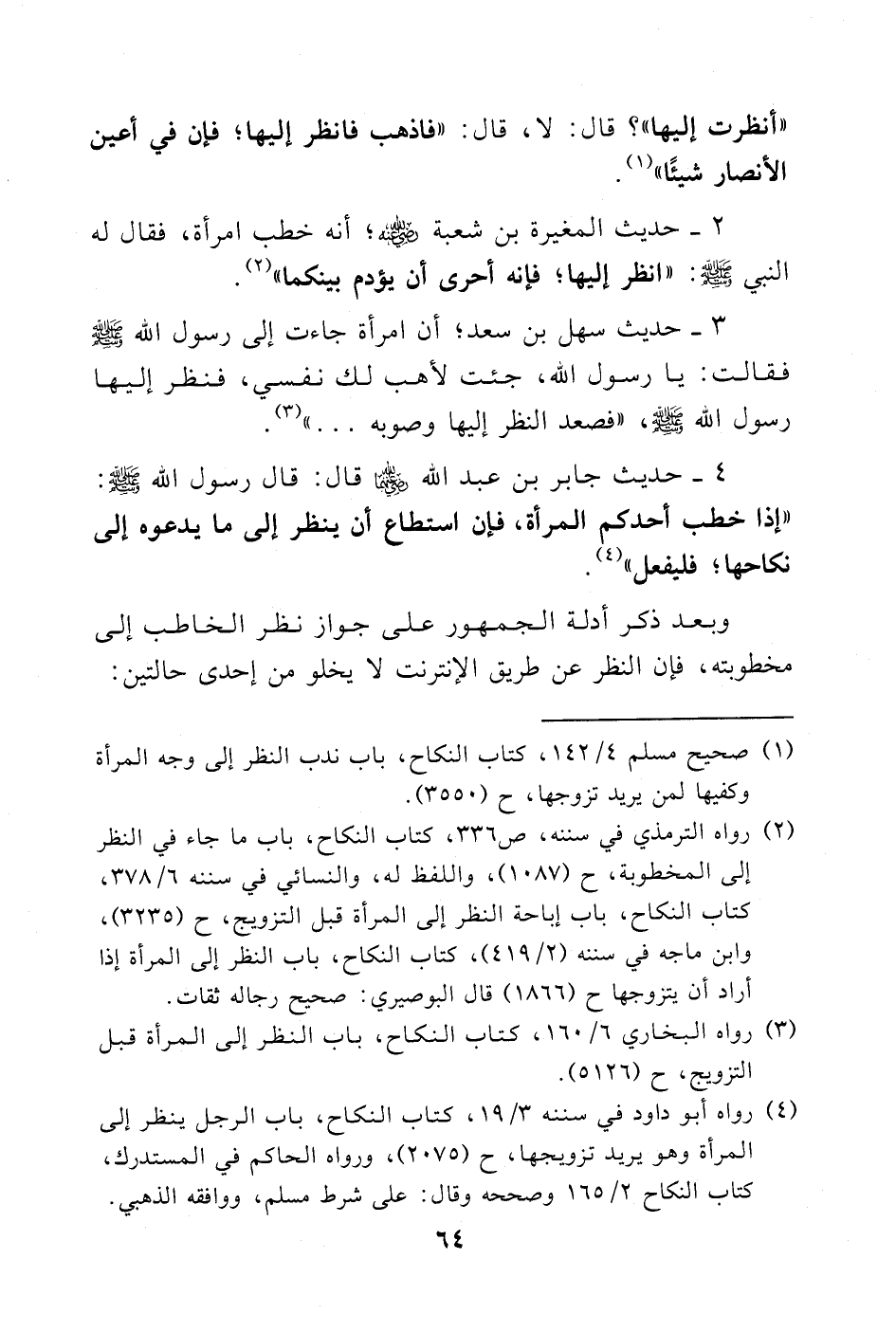 (¬1) صحيح مسلم (4/ 142)، كتاب النكاح، باب ندب النظر إلى وجه المرأة وكفيها لمن يريد تزوجها، ح (3550).
