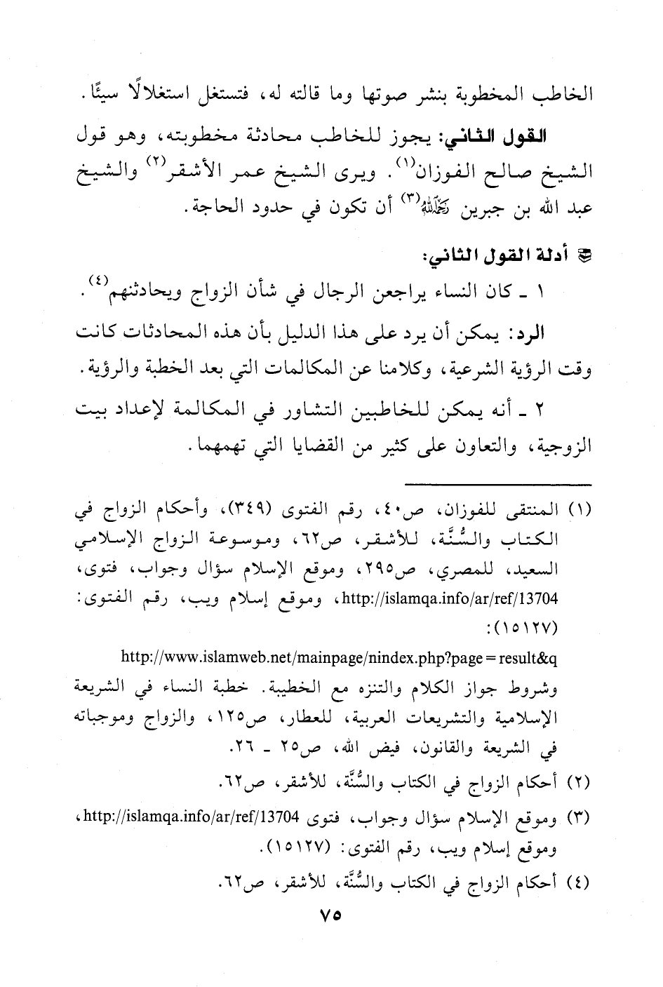 (¬1) المنتقى للفوزان (3/ 145)، رقم الفتوى (349)، وأحكام الزواج في الكتاب والسنة، للأشقر، ص 62، وموسوعة الزواج الإسلامي السعيد، للمصري، ص 295، وموقع الإسلام سؤال وجواب، فتوى 13704، http://islamqa.info/ar/ref/13704، وموقع إسلام ويب، رقم الفتوى: (15127): http://www.islamweb.net/mainpage/nindex.php? page=result&q, وشروط جواز الكلام والتنزه مع الخطيبة. خطبة النساء في الشريعة الإسلامية والتشريعات العربية، للعطار، ص 125، والزواج وموجباته في الشريعة والقانون، فيض الله، ص 25 - 26.