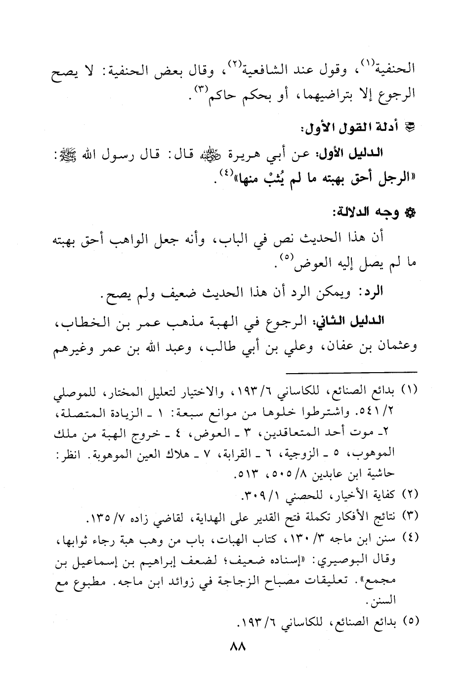 الدليل الأول: عن أبي هريرة (رضي الله عنه) قال: قال رسول الله (صلى الله عليه وسلم): «الرجل أحق بهبته ما لم يُثبْ منها» (¬4).