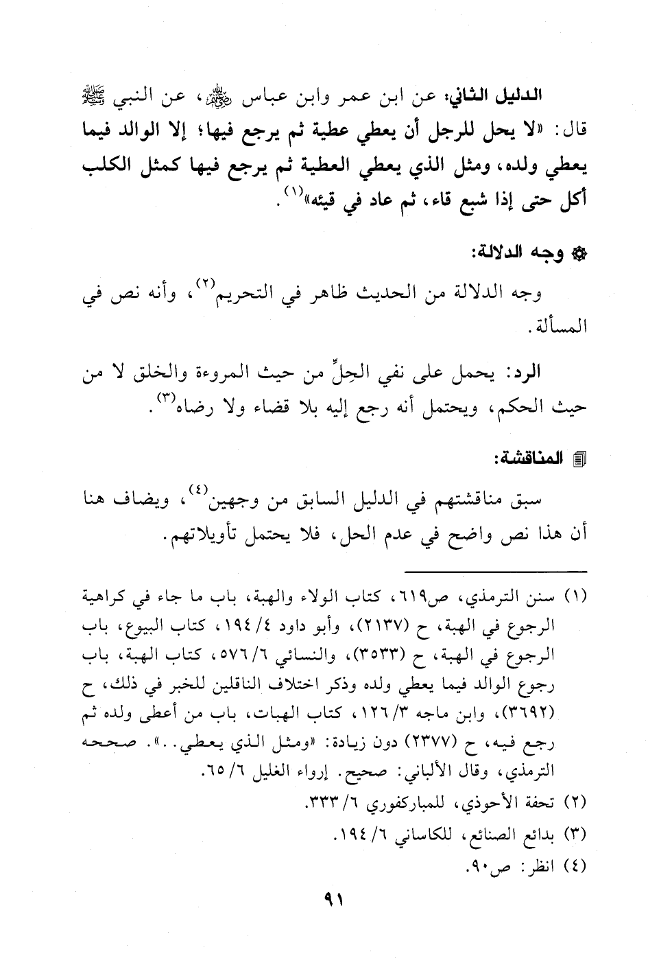 الدليل الثاني: عن ابن عمر وابن عباس (رضي الله عنهم)، عن النبي (صلى الله عليه وسلم) قال: «لا يحل للرجل أن يعطي عطية ثم يرجع فيها، إلا الوالد فيما يعطي ولده، ومثل الذي يعطي العطية ثم يرجع فيها كمثل الكلب أكل حتى إذا شبع قاء، ثم عاد في قيئه» (¬1).