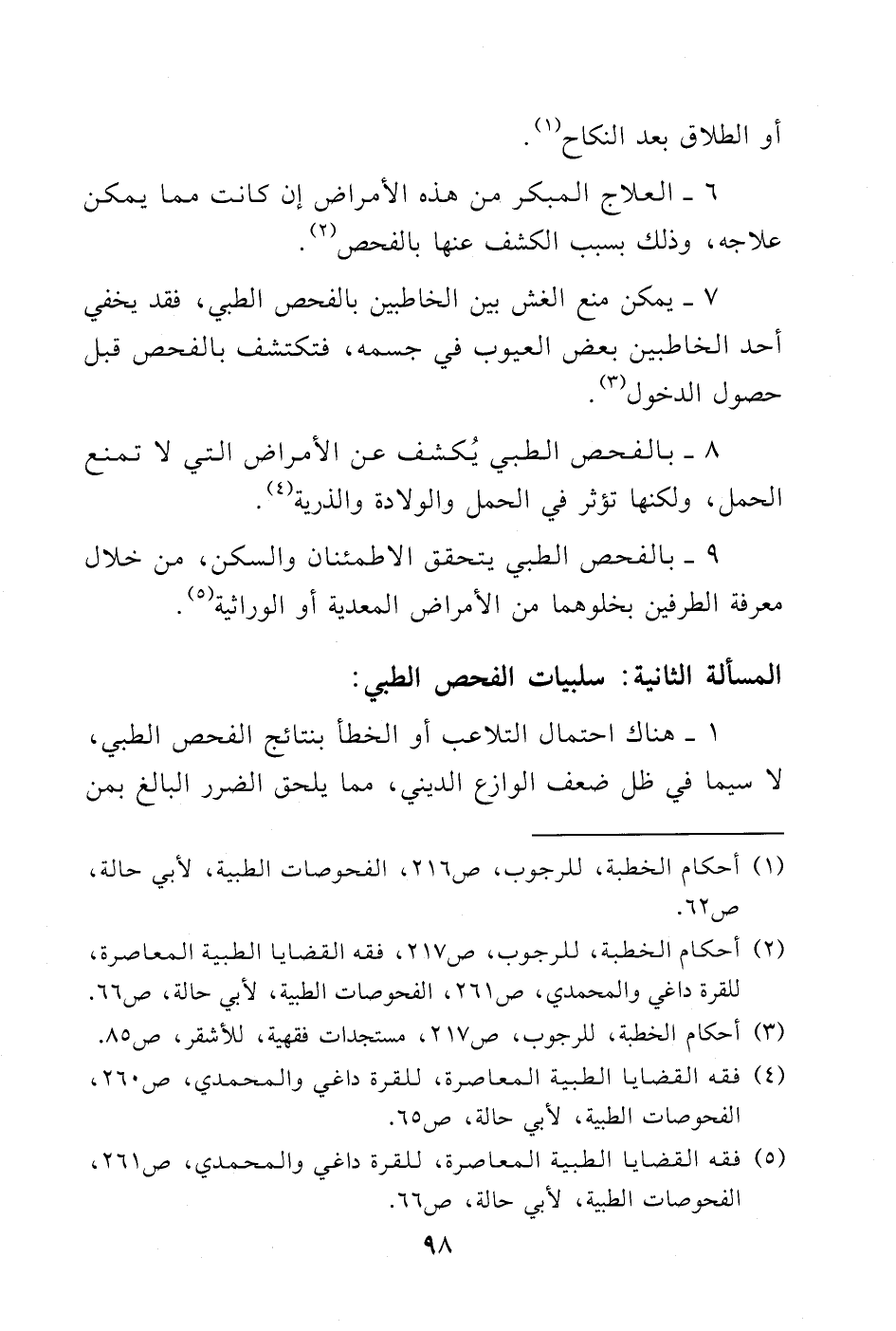(¬2) أحكام الخطبة في الفقه الاسلامي، للرجوب ص 217، وفقه القضايا الطبية المعاصرة، للقرة داغي والمحمدي ص 261، والفحوصات الطبية لأبي حالة ص 66.