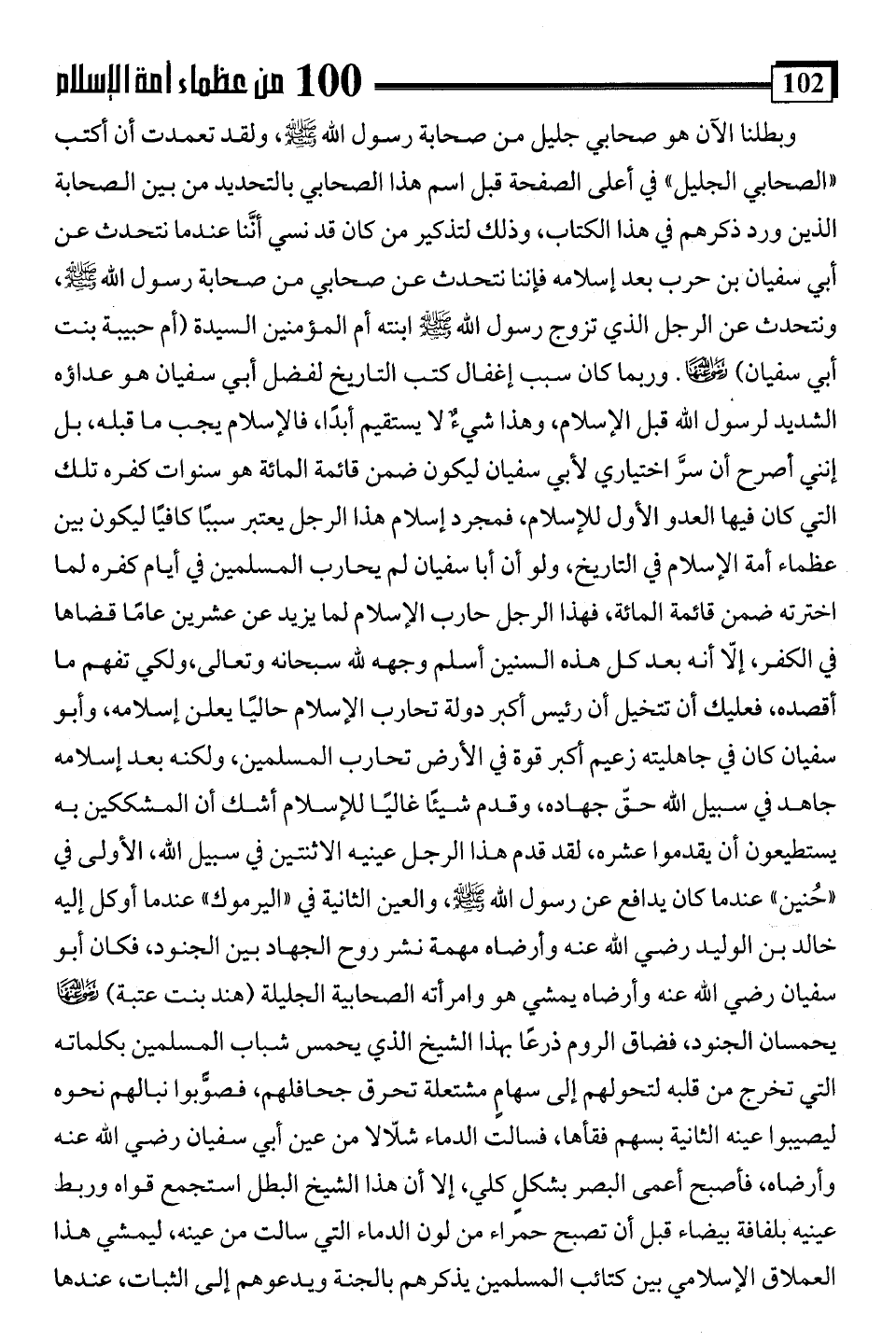 وبطلنا الآن هو صحابي جليل من صحابة رسول اللَّه -صلى اللَّه عليه وسلم-، ولقد تعمدت أن أكتب "الصحابي الجليل" في أعلى الصفحة قبل اسم هذا الصحابي بالتحديد من بين الصحابة الذين ورد ذكرهم في هذا الكتاب، وذلك لتذكير من كان قد نسي أنَّنا عندما نتحدث عن أبي سفيان بن حرب بعد إسلامه فإننا نتحدث عن صحابي من صحابة رسول اللَّه -صلى اللَّه عليه وسلم-، ونتحدث عن الرجل الذي تزوج رسول اللَّه -صلى اللَّه عليه وسلم- ابنته أم المؤمنين السيدة (أم حبيبة بنت أبي سفيان) -رضي اللَّه عنها-. وربما كان سبب إغفال كتب التاريخ لفضل أبي سفيان هو عداؤه الشديد لرسول اللَّه قبل الإسلام، وهذا شيءٌ لا يستقيم أبدًا، فالإسلام يجب ما قبله، بل إنني أصرح أن سرَّ اختياري لأبي سفيان ليكون ضمن قائمة المائة هو سنوات كفره تلك التي كان فيها العدو الأول للإسلام، فمجرد إسلام هذا الرجل يعتبر سببًا كافيًا ليكون بين عظماء أمة الإسلام في التاريخ، ولو أن أبا سفيان لم يحارب المسلمين في أيام كفره لما اخترته ضمن قائمة المائة، فهذا الرجل حارب الإسلام لما يزيد عن عشرين عامًا قضاها في الكفر، إلّا أنه بعد كل هذه السنين أسلم وجهه للَّه سبحانه وتعالى، ولكي تفهم ما أقصده، فعليك أن تتخيل أن رئيس أكبر دولة تحارب الإسلام حاليًا يعلن إسلامه، وأبو سفيان كان في جاهليته زعيم أكبر قوة في الأرض تحارب المسلمين، ولكنه بعد إسلامه جاهد في سبيل اللَّه حقّ جهاده، وقدم شيئًا غاليًا للإسلام أشك أن المشككين به يستطيعون أن يقدموا عشره، لقد قدم هذا الرجل عينيه الاثنتين في سبيل اللَّه، الأولى في "حُنين" عندما كان يدافع عن رسول اللَّه -صلى اللَّه عليه وسلم-، والعين الثانية في "اليرموك" عندما أوكل إليه خالد بن الوليد رضي اللَّه عنه وأرضاه مهمة نشر روح الجهاد بين الجنود، فكان أبو سفيان رضي اللَّه عنه وأرضاه يمشي هو وامرأته الصحابية الجليلة (هند بنت عتبة) -رضي اللَّه عنها- يحمسان الجنود، فضاق الروم ذرعًا بهذا الشيخ الذي يحمس شباب المسلمين بكلماته التي تخرج من قلبه لتحولهم إلى سهامٍ مشتعلة تحرق جحافلهم، فصوَّبوا نبالهم نحوه ليصيبوا عينه الثانية بسهم فقأها، فسالت الدماء شلّالا من عين أبي سفيان رضي اللَّه عنه وأرضاه، فأصبح أعمى البصر بشكلٍ كلي، إلا أن هذا الشيخ البطل استجمع قواه وربط عينيه بلفافة بيضاء قبل أن تصبح حمراء من لون الدماء التي سالت من عينه، ليمشي هذا العملاق الإسلامي بين كتائب المسلمين يذكرهم بالجنة ويدعوهم إلى الثبات، عندها