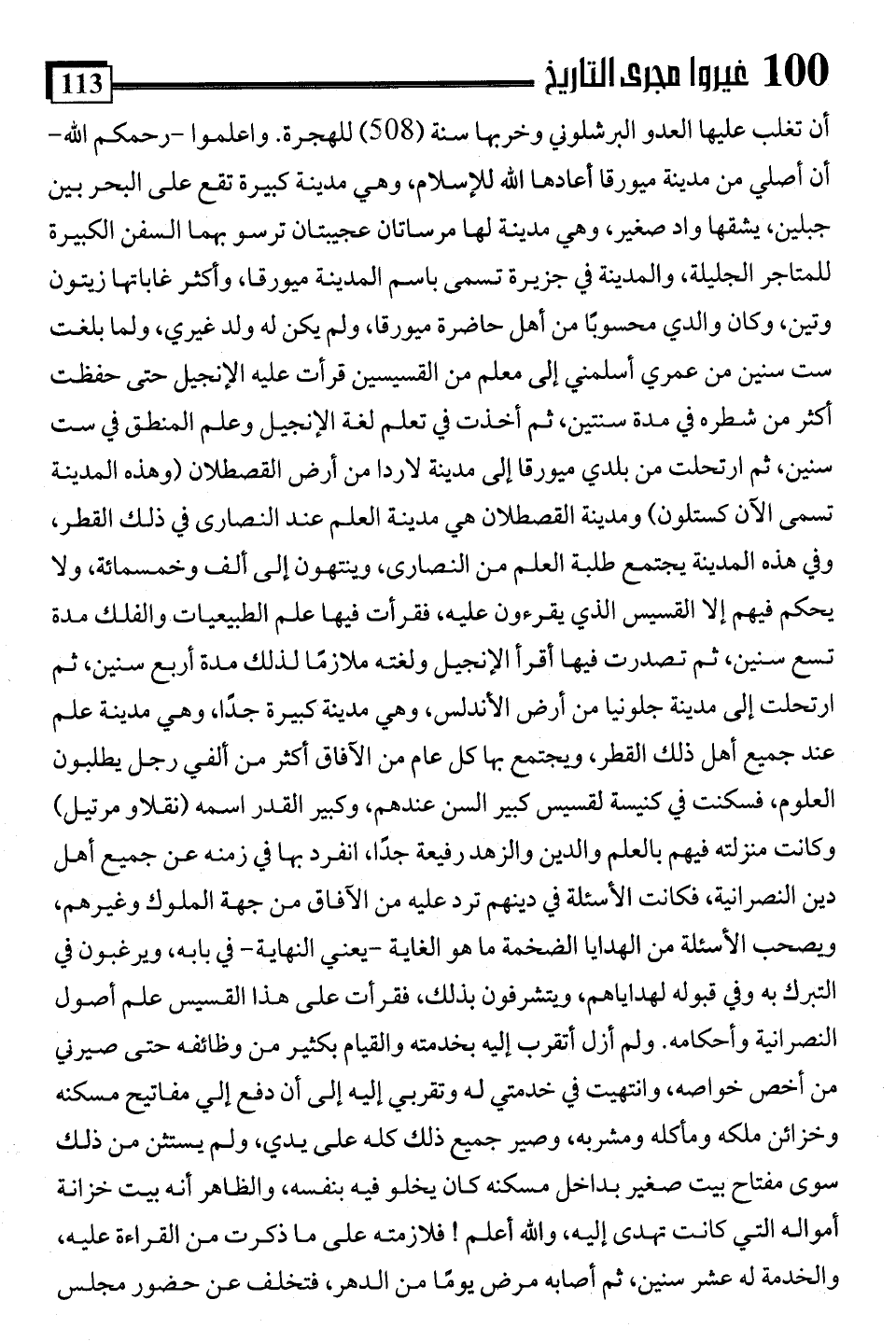 أن تغلب عليها العدو البرشلوني وخربها سنة (508) للهجرة. واعلموا -رحمكم اللَّه- أن أصلي من مدينة ميورقا أعادها اللَّه للإسلام، وهي مدينة كبيرة تقع على البحر بين جبلين، يشقها واد صغير، وهي مدينة لها مرساتان عجيبتان ترسو بهما السفن الكبيرة للمتاجر الجليلة، والمدينة في جزيرة تسمى باسم المدينة ميورقا، وأكثر غاباتها زيتون وتين، وكان والدي محسوبًا من أهل حاضرة ميورقا، ولم يكن له ولد غيري، ولما بلغت ست سنين من عمري أسلمني إلى معلم من القسيسين قرأت عليه الإنجيل حتى حفظت أكثر من شطره في مدة سنتين، ثم أخذت في تعلم لغة الإنجيل وعلم المنطق في ست سنين، ثم ارتحلت من بلدي ميورقا إلى مدينة لاردا من أرض القصطلان (وهذه المدينة تسمى الآن كستلون) ومدينة القصطلان هي مدينة العلم عند النصارى في ذلك القطر، وفي هذه المدينة يجتمع طلبة العلم من النصارى، وينتهون إلى ألف وخمسمائة، ولا يحكم فيهم إلا القسيس الذي يقرءون عليه، فقرأت فيها علم الطبيعيات والفلك مدة تسع سنين، ثم تصدرت فيها أقرأ الإنجيل ولغته ملازمًا لذلك مدة أربع سنين، ثم ارتحلت إلى مدينة جلونيا من أرض الأندلس، وهي مدينة كبيرة جدًا، وهي مدينة علم عند جميع أهل ذلك القطر، ويجتمع بها كل عام من الآفاق أكثر من ألفي رجل يطلبون العلوم، فسكنت في كنيسة لقسيس كبير السن عندهم، وكبير القدر اسمه (نقلاو مرتيل) وكانت منزلته فيهم بالعلم والدين والزهد رفيعة جدًا، انفرد بها في زمنه عن جميع أهل دين النصرانية، فكانت الأسئلة في دينهم ترد عليه من الآفاق من جهة الملوك وغيرهم، ويصحب الأسئلة من الهدايا الضخمة ما هو الغاية -يعني النهاية- في بابه، ويرغبون في التبرك به وفي قبوله لهداياهم، ويتشرفون بذلك، فقرأت على هذا القسيس علم أصول النصرانية وأحكامه. ولم أزل أتقرب إليه بخدمته والقيام بكثير من وظائفه حتى صيرني من أخص خواصه، وانتهيت في خدمتي له وتقربي إليه إلى أن دفع إلي مفاتيح مسكنه وخزائن ملكه ومأكله ومشربه، وصير جميع ذلك كله على يدي، ولم يستثن من ذلك سوى مفتاح بيت صغير بداخل مسكنه كان يخلو فيه بنفسه، والظاهر أنه بيت خزانة أمواله التي كانت تهدى إليه، واللَّه أعلم! فلازمته على ما ذكرت من القراءة عليه، والخدمة له عشر سنين، ثم أصابه مرض يومًا من الدهر، فتخلف عن حضور مجلس