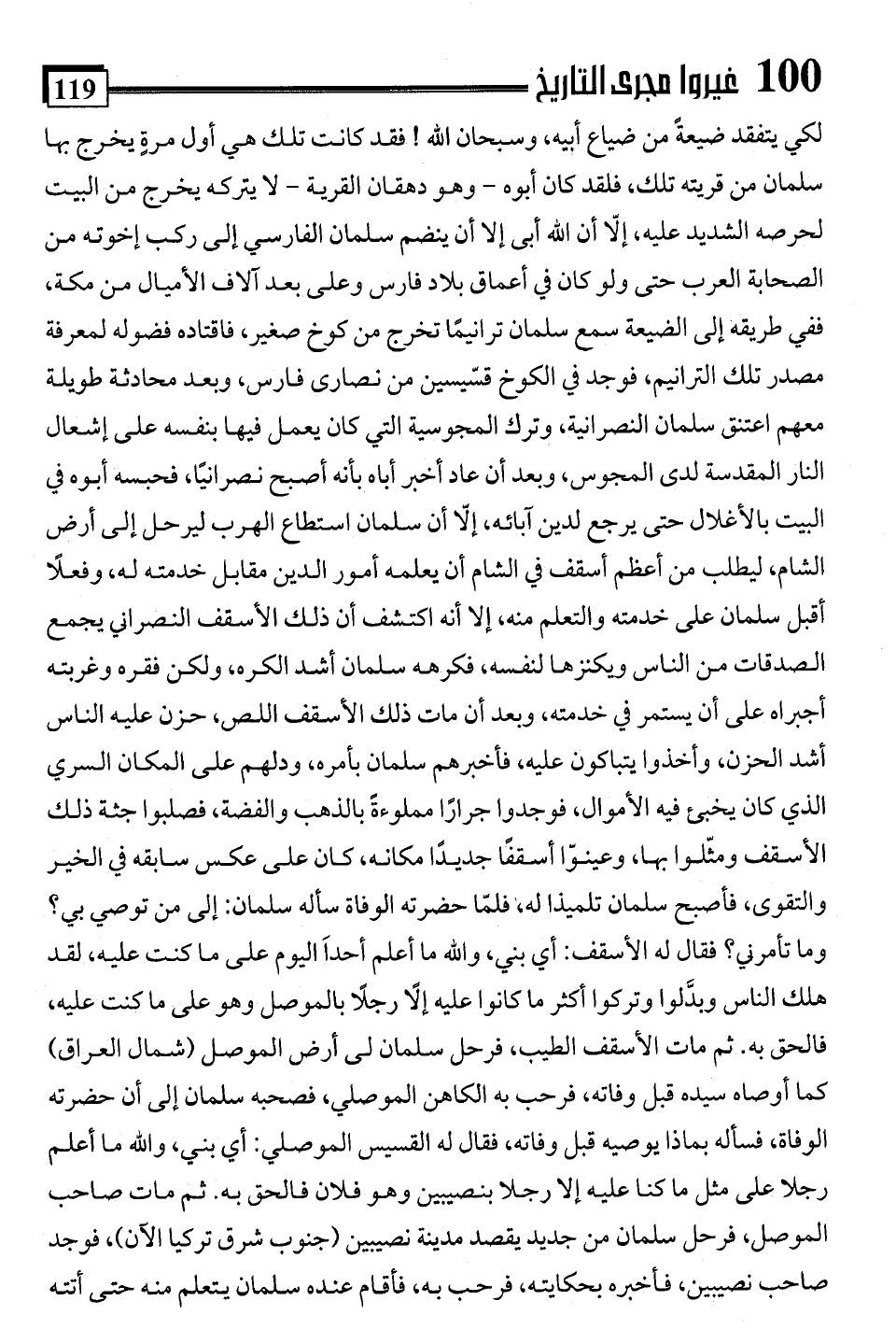 لكي يتفقد ضيعةً من ضياع أبيه، وسبحان اللَّه! فقد كانت تلك هي أول مرةٍ يخرج بها سلمان من قريته تلك، فلقد كان أبوه -وهو دهقان القرية- لا يتركه يخرج من البيت لحرصه الشديد عليه، إلّا أن اللَّه أبى إلا أن ينضم سلمان الفارسي إلى ركب إخوته من الصحابة العرب حتى ولو كان في أعماق بلاد فارس وعلى بعد آلاف الأميال من مكة، ففي طريقه إلى الضيعة سمع سلمان ترانيمًا تخرج من كوخ صغير، فاقتاده فضوله لمعرفة مصدر تلك الترانيم، فوجد في الكوخ قسّيسين من نصارى فارس، وبعد محادثة طويلة معهم اعتنق سلمان النصرانية، وترك المجوسية التي كان يعمل فيها بنفسه على إشعال النار المقدسة لدى المجوس، وبعد أن عاد أخبر أباه بأنه أصبح نصرانيًا، فحبسه أبوه في البيت بالأغلال حتى يرجع لدين آبائه، إلّا أن سلمان استطاع الهرب ليرحل إلى أرض الشام، ليطلب من أعظم أسقف في الشام أن يعلمه أمور الدين مقابل خدمته له، وفعلًا أقبل سلمان على خدمته والتعلم منه، إلا أنه اكتشف أن ذلك الأسقف النصراني يجمع الصدقات من الناس ويكنزها لنفسه، فكرهه سلمان أشد الكره، ولكن فقره وغربته أجبراه على أن يستمر في خدمته، وبعد أن مات ذلك الأسقف اللص، حزن عليه الناس أشد الحزن، وأخذوا يتباكون عليه، فأخبرهم سلمان بأمره، ودلهم على المكان السري الذي كان يخبئ فيه الأموال، فوجدوا جرارًا مملوءةً بالذهب والفضة، فصلبوا جثة ذلك الأسقف ومثّلوا بها، وعينوّا أسقفًا جديدًا مكانه، كان على عكس سابقه في الخير والتقوى، فأصبح سلمان تلميذا له، فلمّا حضرته الوفاة سأله سلمان: إلى من توصي بي؟ وما تأمرني؟ فقال له الأسقف: أي بني، واللَّه ما أعلم أحدًا اليوم على ما كنت عليه، لقد هلك الناس وبدَّلوا وتركوا أكثر ما كانوا عليه إلًا رجلًا بالموصل وهو على ما كنت عليه، فالحق به. ثم مات الأسقف الطيب، فرحل سلمان لى أرض الموصل (شمال العراق) كما أوصاه سيده قبل وفاته، فرحب به الكاهن الموصلي، فصحبه سلمان إلى أن حضرته الوفاة، فسأله بماذا يوصيه قبل وفاته، فقال له القسيس الموصلي: أي بني، واللَّه ما أعلم رجلا على مثل ما كنا عليه إلا رجلا بنصيبين وهو فلان فالحق به. ثم مات صاحب الموصل، فرحل سلمان من جديد يقصد مدينة نصيبين (جنوب شرق تركيا الآن)، فوجد صاحب نصيبين، فأخبره بحكايته، فرحب به، فأقام عنده سلمان يتعلم منه حتى أتته