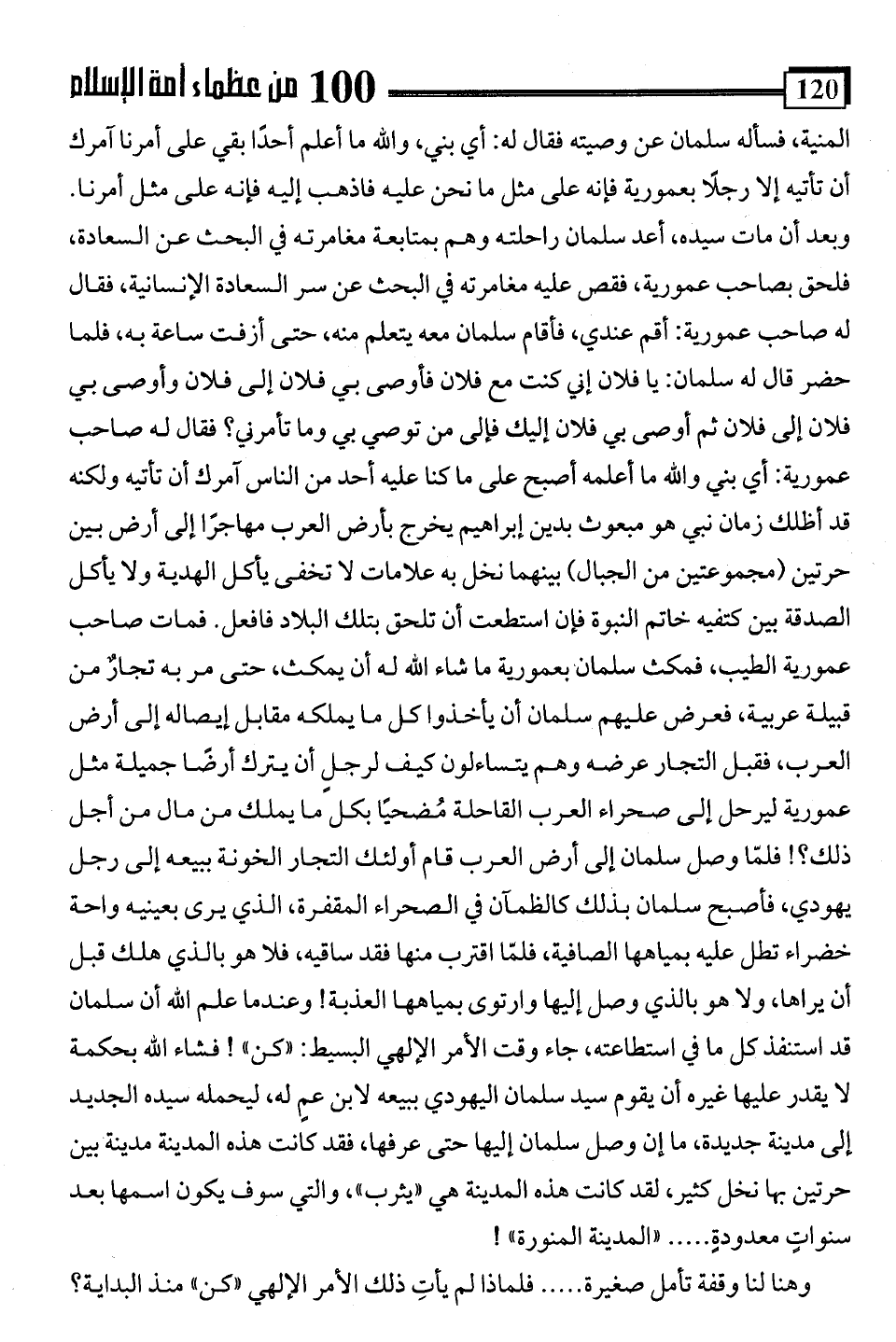 المنية، فسأله سلمان عن وصيته فقال له: أي بني، واللَّه ما أعلم أحدًا بقي على أمرنا آمرك أن تأتيه إلا رجلًا بعمورية فإنه على مثل ما نحن عليه فاذهب إليه فإنه على مثل أمرنا. وبعد أن مات سيده، أعد سلمان راحلته وهم بمتابعة مغامرته في البحث عن السعادة، فلحق بصاحب عمورية، فقص عليه مغامرته في البحث عن سر السعادة الإنسانية، فقال له صاحب عمورية: أقم عندي، فأقام سلمان معه يتعلم منه، حتى أزفت ساعة به، فلما حضر قال له سلمان: يا فلان إني كنت مع فلان فأوصى بي فلان إلى فلان وأوصى بي فلان إلى فلان ثم أوصى بي فلان إليك فإلى من توصي بي وما تأمرني؟ فقال له صاحب عمورية: أي بني واللَّه ما أعلمه أصبح على ما كنا عليه أحد من الناس آمرك أن تأتيه ولكنه قد أظلك زمان نبي هو مبعوث بدين إبراهيم يخرج بأرض العرب مهاجرًا إلى أرض بين حرتين (مجموعتين من الجبال) بينهما نخل به علامات لا تخفى يأكل الهدية ولا يأكل الصدقة بين كتفيه خاتم النبوة فإن استطعت أن تلحق بتلك البلاد فافعل. فمات صاحب عمورية الطيب، فمكث سلمان "بعمورية ما شاء اللَّه له أن يمكث، حتى مر به تجارٌ من قبيلة عربية، فعرض عليهم سلمان أن يأخذوا كل ما يملكه مقابل إيصاله إلى أرض العرب، فقبل التجار عرضه وهم يتساءلون كيف لرجلٍ أن يترك أرضًا جميلة مثل عمورية ليرحل إلى صحراء العرب القاحلة مُضحيًا بكل ما يملك من مال من أجل ذلك؟! فلمّا وصل سلمان إلى أرض العرب قام أولئك التجار الخونة ببيعه إلى رجل يهودي، فأصبح سلمان بذلك كالظمآن في الصحراء المقفرة، الذي يرى بعينيه واحة خضراء تطل عليه بمياهها الصافية، فلمّا اقترب منها فقد ساقيه، فلا هو بالذي هلك قبل أن يراها، ولا هو بالذي وصل إليها وارتوى بمياهها العذبة! وعندما علم اللَّه أن سلمان قد استنفذ كل ما في استطاعته، جاء وقت الأمر الإلهي البسيط: "كن"! فشاء اللَّه بحكمة لا يقدر عليها غيره أن يقوم سيد سلمان اليهودي ببيعه لابن عمٍ له، ليحمله سيده الجديد إلى مدينة جديدة، ما إن وصل سلمان إليها حتى عرفها، فقد كانت هذه المدينة مدينة بين حرتين بها نخل كثير، لقد كانت هذه المدينة هي "يثرب"، والتي سوف يكون اسمها بعد سنواتٍ معدودةٍ. . . . "المدينة المنورة"!