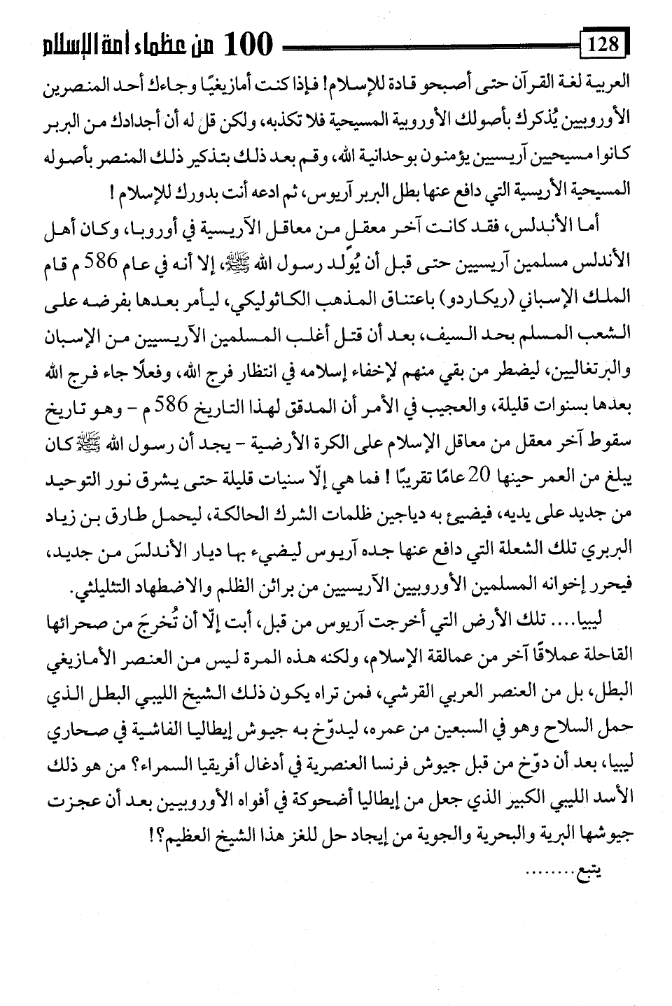 العربية لغة القرآن حتى أصبحو قادة للإسلام! فإذا كنت أمازيغيًا وجاءك أحد المنصرين الأوروبيين يُذكرك بأصولك الأوروبية المسيحية فلا تكذبه، ولكن قل له أن أجدادك من البربر كانوا مسيحيين آريسيين يؤمنون بوحدانية اللَّه، وقم بعد ذلك بتذكير ذلك المنصر بأصوله المسيحية الأريسية التي دافع عنها بطل البربر آريوس، ثم ادعه أنت بدورك للإسلام!