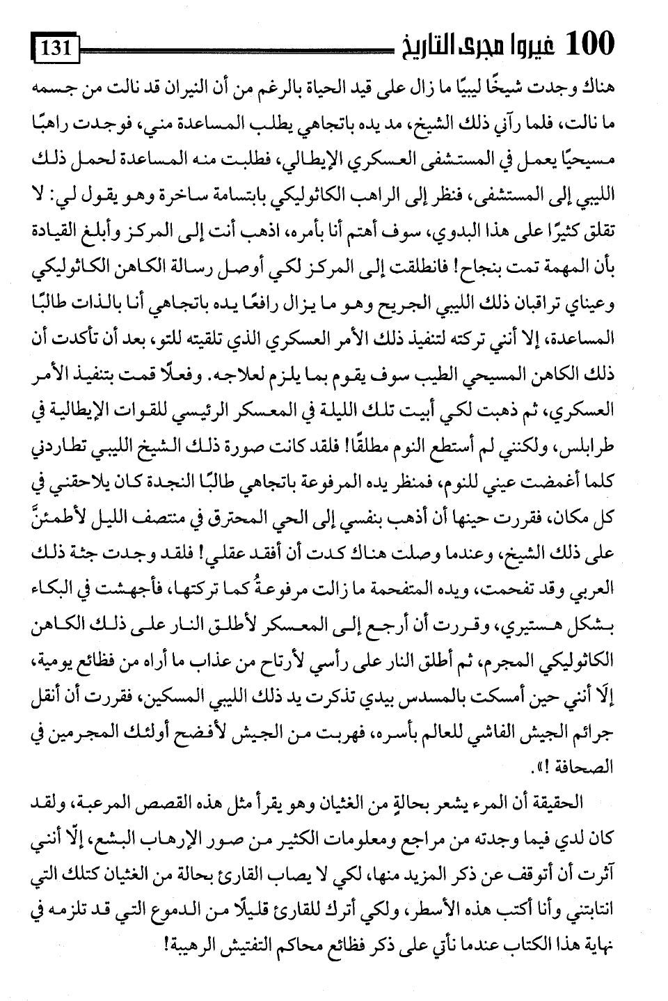 هناك وجدت شيخا ليبيًا ما زال على قيد الحياة بالرغم من أن النيران قد نالت من جسمه ما نالت، فلما رآني ذلك الشيخ، مد يده باتجاهي يطلب المساعدة مني، فوجدت راهبًا مسيحيًا يعمل في المستشفى العسكري الإيطالي، فطلبت منه المساعدة لحمل ذلك الليبي إلى المستشفى، فنظر إلى الراهب الكاثوليكي بابتسامة ساخرة وهو يقول لي: لا تقلق كثيرًا على هذا البدوي، سوف أهتم أنا بأمره، اذهب أنت إلى المركز وأبلغ القيادة بأن المهمة تمت بنجاح! فانطلقت إلى المركز لكي أوصل رسالة الكاهن الكاثوليكي وعيناي تراقبان ذلك الليبي الجريح وهو ما يزال رافعًا يده باتجاهي أنا بالذات طالبًا المساعدة، إلا أنني تركته لتنفيذ ذلك الأمر العسكري الذي تلقيته للتو، بعد أن تأكدت أن ذلك الكاهن المسيحي الطيب سوف يقوم بما يلزم لعلاجه. وفعلًا قمت بتنفيذ الأمر العسكري، ثم ذهبت لكي أبيت تلك الليلة في المعسكر الرئيسي للقوات الإيطالية في طرابلس، ولكنني لم أستطع النوم مطلقًا! فلقد كانت صورة ذلك الشيخ الليبي تطاردني كلما أغمضت عيني للنوم، فمنظر يده المرفوعة باتجاهي طالبًا النجدة كان يلاحقني في كل مكان، فقررت حينها أن أذهب بنفسي إلى الحي المحترق في منتصف الليل لأطمئنَّ على ذلك الشيخ، وعندما وصلت هناك كدت أن أفقد عقلي! فلقد وجدت جثة ذلك العربي وقد تفحمت، ويده المتفحمة ما زالت مرفوعةُ كما تركتها، فأجهشت في البكاء بشكل هستيري، وقررت أن أرجع إلى المعسكر لأطلق النار على ذلك الكاهن الكاثوليكي المجرم، ثم أطلق النار على رأسي لأرتاح من عذاب ما أراه من فظائع يومية، إلَا أنني حين أمسكت بالمسدس بيدي تذكرت يد ذلك الليبي المسكين، فقررت أن أنقل جرائم الجيش الفاشي للعالم بأسره، فهربت من الجيش لأفضح أولئك المجرمين في الصحافة! ".