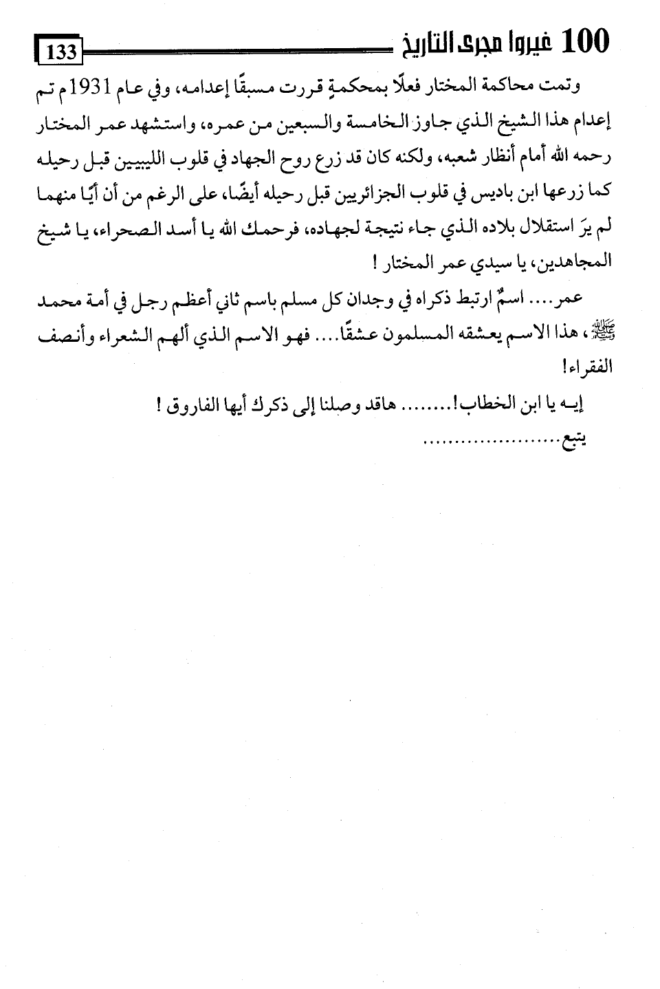 وتمت محاكمة المختار فعلًا بمحكمةٍ قررت مسبقًا إعدامه، وفي عام 1931 م تم إعدام هذا الشيخ الذي جاوز الخامسة والسبعين من عمره، واستشهد عمر المختار رحمه اللَّه أمام أنظار شعبه، ولكنه كان قد زرع روح الجهاد في قلوب الليبيين قبل رحيله كما زرعها ابن باديس في قلوب الجزائريين قبل رحيله أيضًا، على الرغم من أن أيًا منهما لم يرَ استقلال بلاده الذي جاء نتيجة لجهاده، فرحمك اللَّه يا أسد الصحراء، يا شيخ المجاهدين، يا سيدي عمر المختار!
