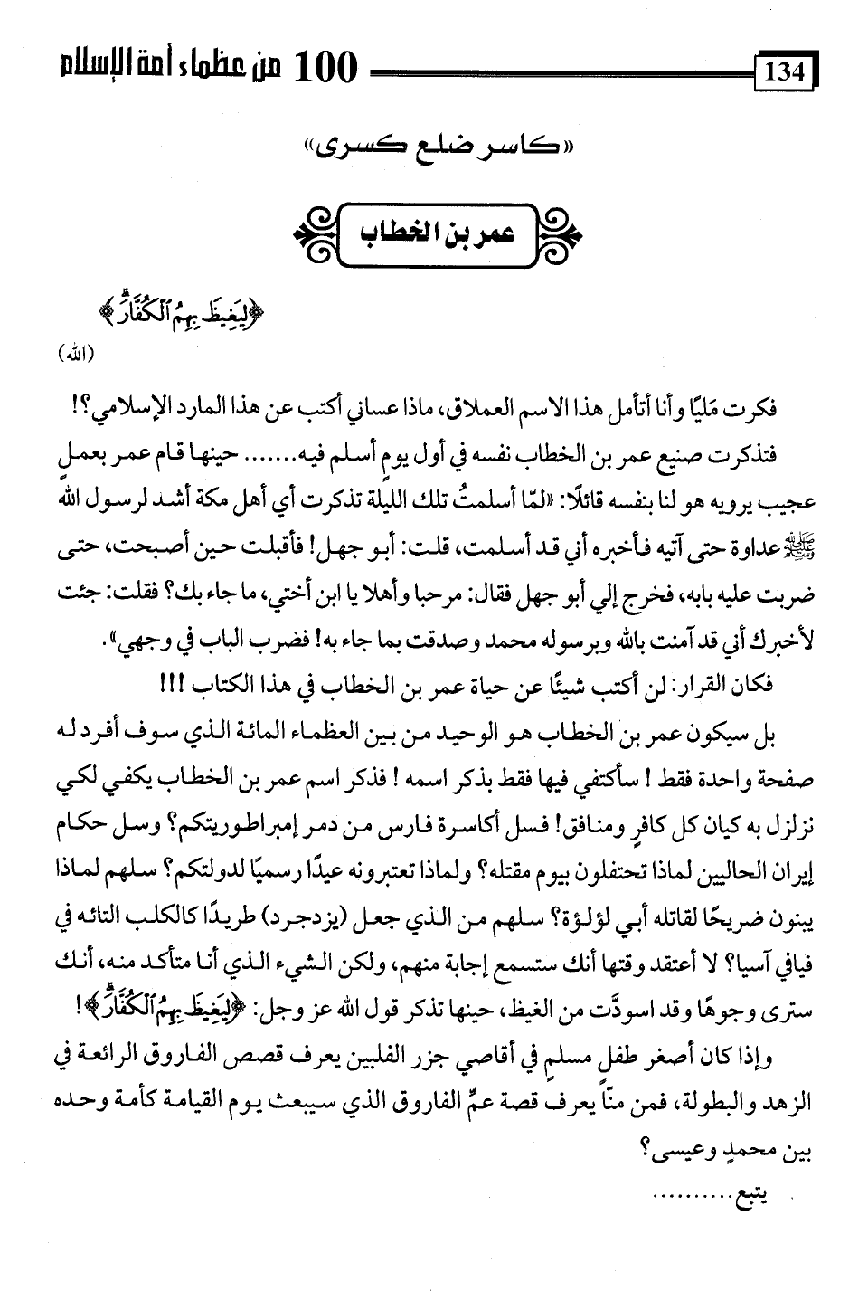 بل سيكون عمر بن الخطاب هو الوحيد من بين العظماء المائة الذي سوف أفرد له صفحة واحدة فقط! سأكتفي فيها فقط بذكر اسمه! فذكر اسم عمر بن الخطاب يكفي لكي نزلزل به كيان كل كافرٍ ومنافق! فسل أكاسرة فارس من دمر إمبراطوريتكم؟ وسل حكام إيران الحاليين لماذا تحتفلون بيوم مقتله؟ ولماذا تعتبرونه عيدًا رسميًا لدولتكم؟ سلهم لماذا يبنون ضريحًا لقاتله أبي لؤلؤة؟ سلهم من الذي جعل (يزدجرد) طريدًا كالكلب التائه في فيافي آسيا؟ لا أعتقد وقتها أنك ستسمع إجابة منهم، ولكن الشيء الذي أنا متأكد منه، أنك سترى وجوهًا وقد اسودَّت من الغيظ، حينها تذكر قول اللَّه عز وجل: {لِيَغِيظَ بِهِمُ الْكُفَّارَ}!