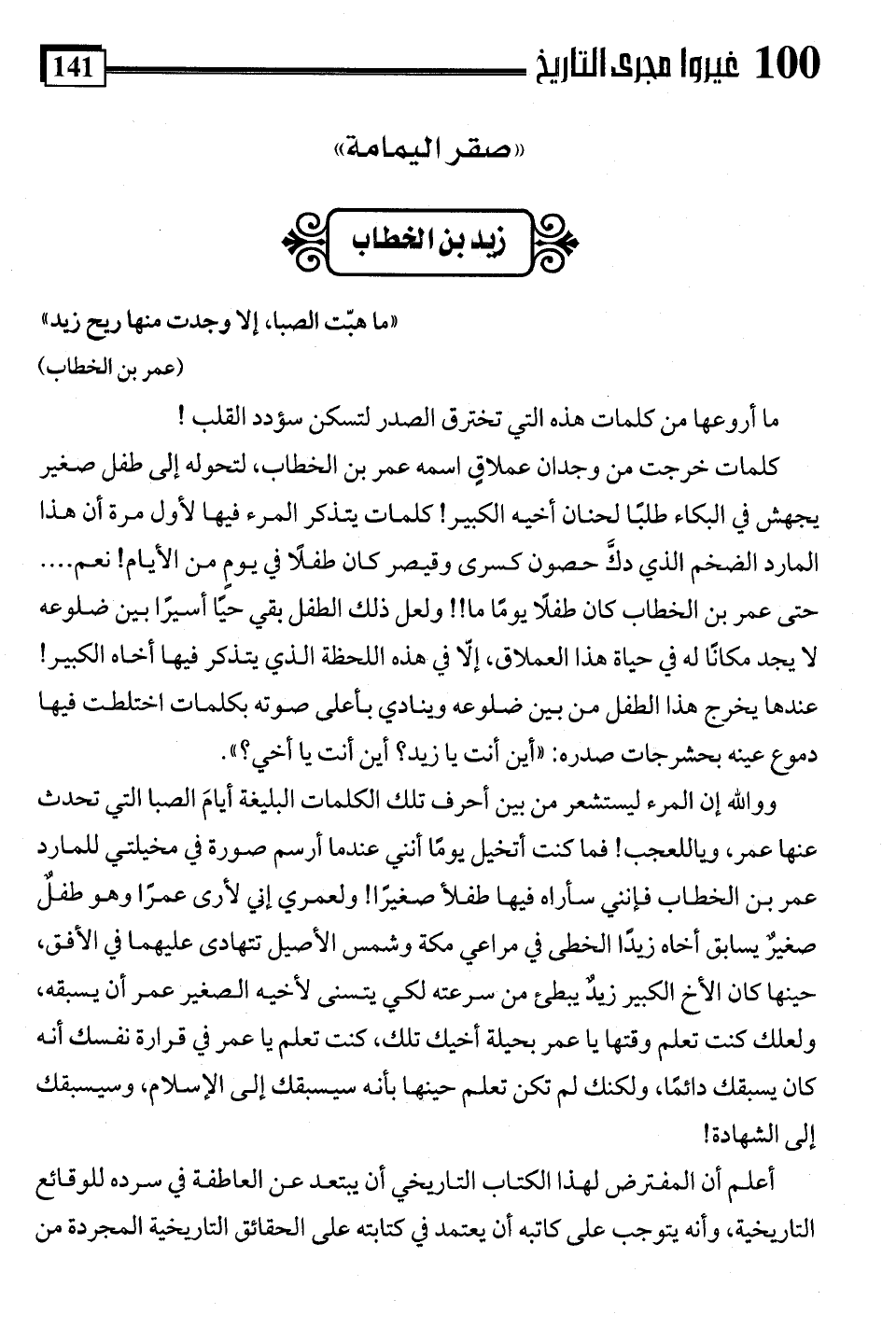 وواللَّه إن المرء ليستشعر من بين أحرف تلك الكلمات البليغة أيامَ الصبا التي تحدث عنها عمر، وياللعجب! فما كنت أتخيل يومًا أنني عندما أرسم صورة في مخيلتي للمارد عمر بن الخطاب فإنني سأراه فيها طفلًا صغيرًا! ولعمري إني لأرى عمرًا وهو طفلٌ صغيرٌ يسابق أخاه زيدًا الخطى في مراعي مكة وشمس الأصيل تتهادى عليهما في الأفق، حينها كان الأخ الكبير زيدٌ يبطئ من سرعته لكي يتسنى لأخيه الصغير عمر أن يسبقه، ولعلك كنت تعلم وقتها يا عمر بحيلة أخيك تلك، كنت تعلم يا عمر في قرارة نفسك أنه كان يسبقك دائمًا، ولكنك لم تكن تعلم حينها بأنه سيسبقك إلى الإسلام، وسيسبقك إلى الشهادة!