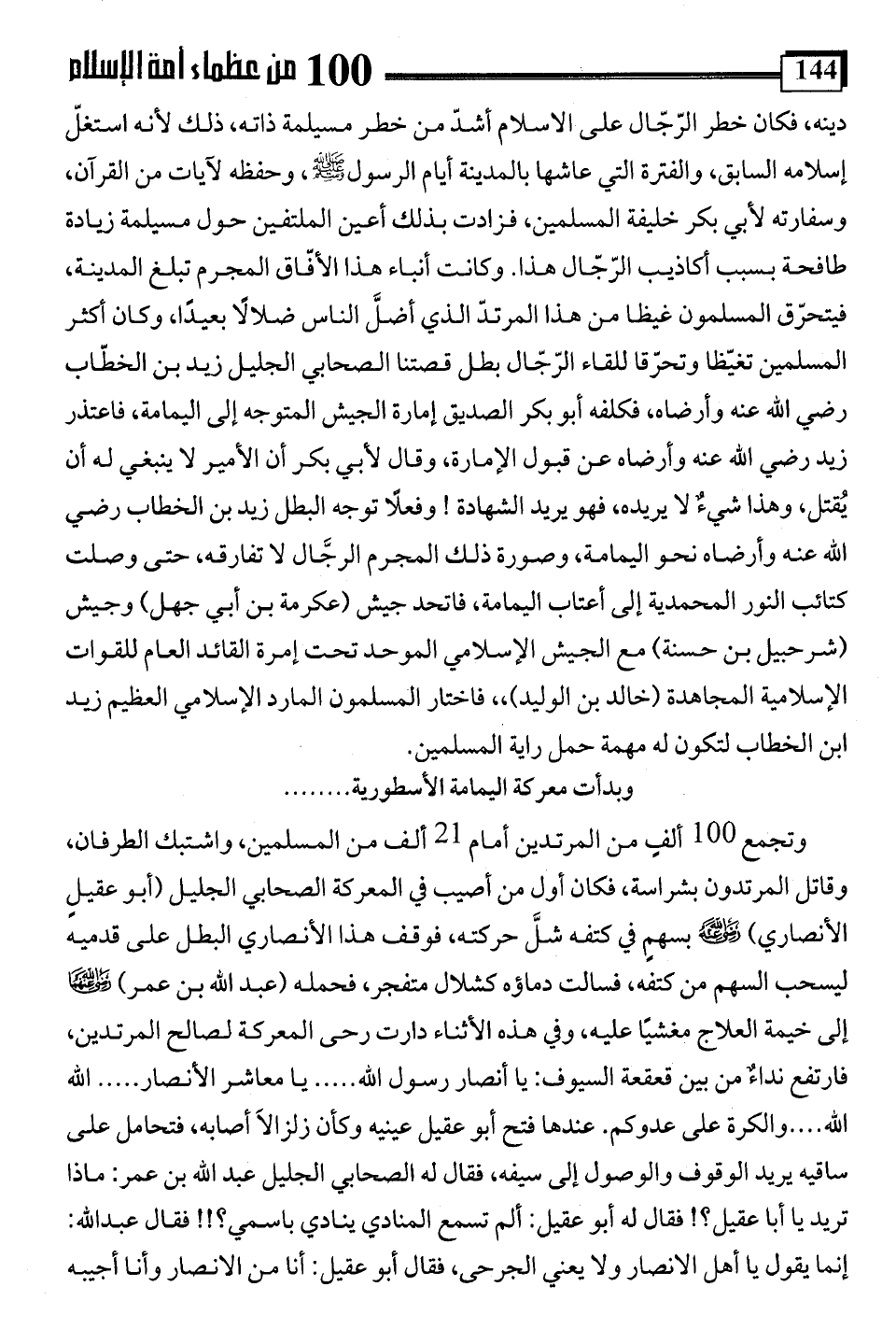 وتجمع 100 ألفٍ من المرتدين أمام 21 ألف من المسلمين، واشتبك الطرفان، وقاتل المرتدون بشراسة، فكان أول من أصيب في المعركة الصحابي الجليل (أبو عقيلٍ الأنصاري) -رضي اللَّه عنه- بسهمٍ في كتفه شلَّ حركته، فوقف هذا الأنصاري البطل على قدميه ليسحب السهم من كتفه، فسالت دماؤه كشلال متفجر، فحمله (عبد اللَّه بن عمر) -رضي اللَّه عنهما- إلى خيمة العلاج مغشيًا عليه، وفي هذه الأثناء دارت رحى المعركة لصالح المرتدين، فارتفع نداءٌ من بين قعقعة السيوف: يا أنصار رسول اللَّه. . . . يا معاشر الأنصار. . . . اللَّه اللَّه. . . . والكرة على عدوكم. عندها فتح أبو عقيل عينيه وكأن زلزالًا أصابه، فتحامل على ساقيه يريد الوقوف والوصول إلى سيفه، فقال له الصحابي الجليل عبد اللَّه بن عمر: ماذا تريد يا أبا عقيل؟! فقال له أبو عقيل: ألم تسمع المنادي ينادي باسمي؟!! فقال عبد اللَّه: إنما يقول يا أهل الانصار ولا يعني الجرحى، فقال أبو عقيل: أنا من الانصار وأنا أجيبه