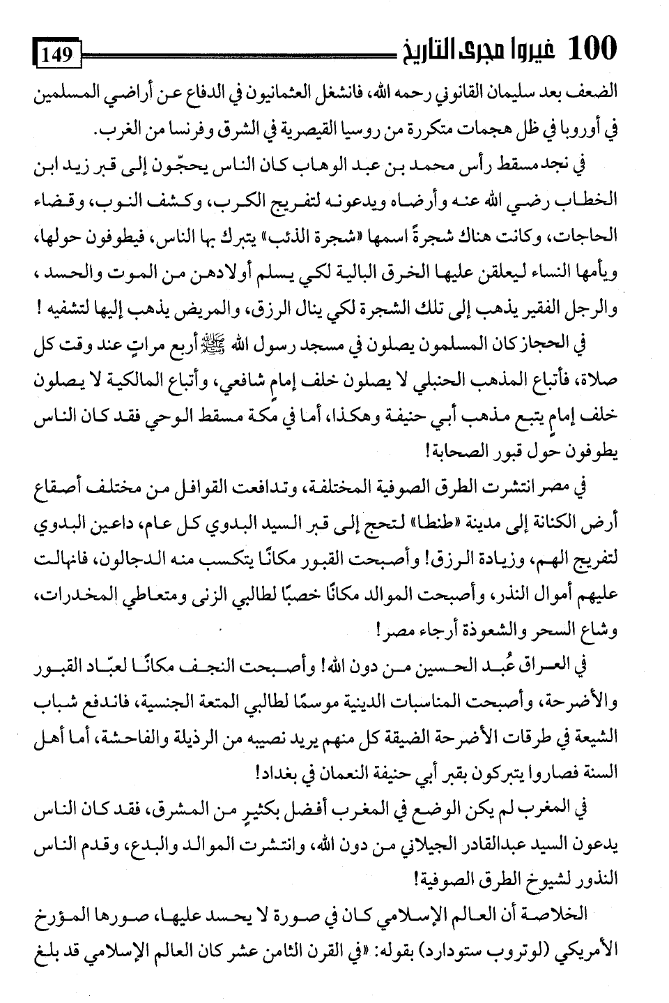 في الحجاز كان المسلمون يصلون في مسجد رسول اللَّه -صلى اللَّه عليه وسلم- أربع مراتٍ عند وقت كل صلاة، فأتباع المذهب الحنبلي لا يصلون خلف إمامٍ شافعي، وأتباع المالكية لا يصلون خلف إمامٍ يتبع مذهب أبي حنيفة وهكذا، أما في مكة مسقط الوحي فقد كان الناس يطوفون حول قبور الصحابة!