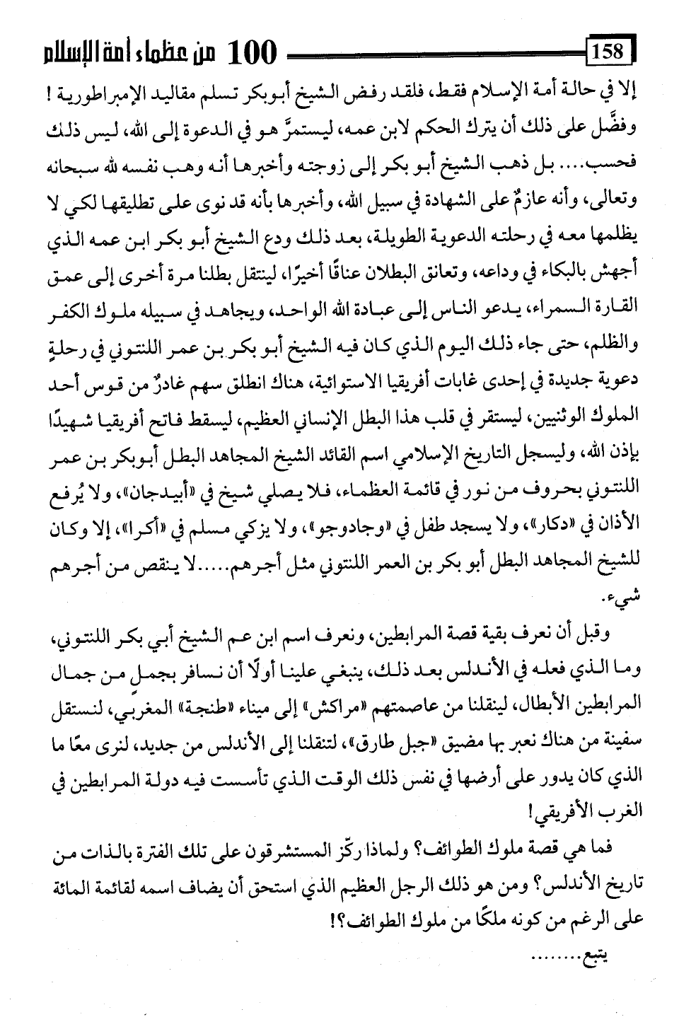 إلا في حالة أمة الإسلام فقط، فلقد رفض الشيخ أبو بكر تسلم مقاليد الإمبراطورية! وفضَّل على ذلك أن يترك الحكم لابن عمه، ليستمرَّ هو في الدعوة إلى اللَّه، ليس ذلك فحسب. . . . بل ذهب الشيخ أبو بكر إلى زوجته وأخبرها أنه وهب نفسه للَّه سبحانه وتعالى، وأنه عازمٌ على الشهادة في سبيل اللَّه، وأخبرها بأنه قد نوى على تطليقها لكي لا يظلمها معه في رحلته الدعوية الطويلة، بعد ذلك ودع الشيخ أبو بكر ابن عمه الذي أجهش بالبكاء في وداعه، وتعانق البطلان عناقًا أخيرًا، لينتقل بطلنا مرة أخرى إلى عمق القارة السمراء، يدعو الناس إلى عبادة اللَّه الواحد، ويجاهد في سبيله ملوك الكفر والظلم، حتى جاء ذلك اليوم الذي كان فيه الشيخ أبو بكر بن عمر اللنتوني في رحلةٍ دعوية جديدة في إحدى غابات أفريقيا الاستوائية، هناك انطلق سهم غادرٌ من قوس أحد الملوك الوثنيين، ليستقر في قلب هذا البطل الإنساني العظيم، ليسقط فاتح أفريقيا شهيدًا بإذن اللَّه، وليسجل التاريخ الإسلامي اسم القائد الشيخ المجاهد البطل أبو بكر بن عمر اللنتوني بحروف من نور في قائمة العظماء، فلا يصلي شيخ في "أبيدجان"، ولا يُرفع الأذان في "دكار"، ولا يسجد طفل في "وجادوجو"، ولا يزكي مسلم في "أكرا"، إلا وكان للشيخ المجاهد البطل أبو بكر بن العمر اللنتوني مثل أجرهم. . . . لا ينقص من أجرهم شيء.