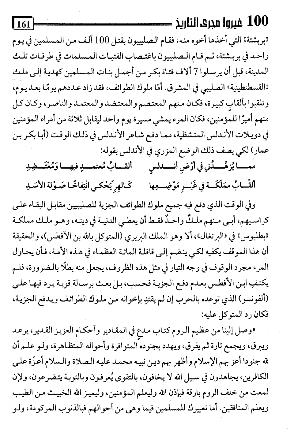 "بربشتة" التي أخذها أخوه منه، فقام الصليبيون بقتل 100 ألف من المسلمين في يوم واحد في بربشتة، ثم قام الصليبيون باغتصاب الفتيات المسلمات في طرقات تلك المدينة، قبل أن يرسلوا 7 ألاف فتاة بكر من أجمل بنات المسلمين كهدية إلى ملك "القسطنطينية" الصليبي في المشرق. أمّا ملوك الطوائف، فقد زاد عددهم يومًا بعد يوم، وتلقبوا بألقابٍ كبيرة، فكان منهم المعتصم والمعتضد والمعتمد والناصر، وكان كل منهم أميرًا للمؤمنين، فكان المرء يمشي مسيرة يوم واحد ليقابل ثلاثة من أمراء المؤمنين في دويلات الأندلس المتشظية، مما دفع شاعر الأندلس في ذلك الوقت (أبا بكر بن عمار) لكي يصف ذلك الوضع المزري في الأندلس بقوله: