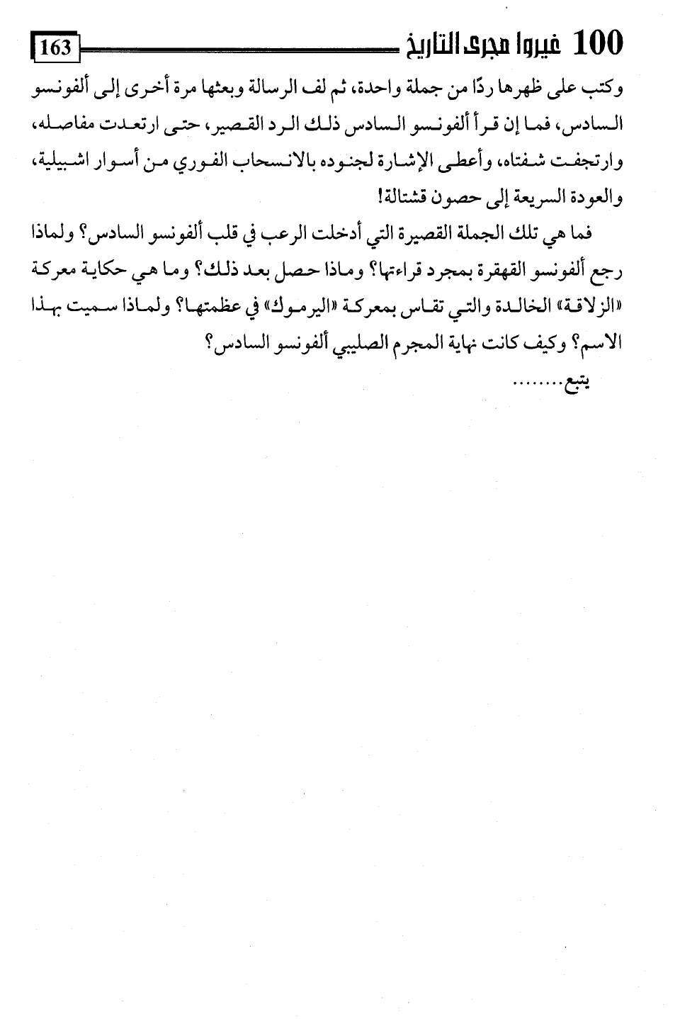 فما هي تلك الجملة القصيرة التي أدخلت الرعب في قلب ألفونسو السادس؟ ولماذا رجع ألفونسو القهقرة بمجرد قراءتها؟ وماذا حصل بعد ذلك؟ وما هي حكاية معركة "الزلاقة" الخالدة والتي تقاس بمعركة "اليرموك" في عظمتها؟ ولماذا سميت بهذا الاسم؟ وكيف كانت نهاية المجرم الصليبي ألفونسو السادس؟