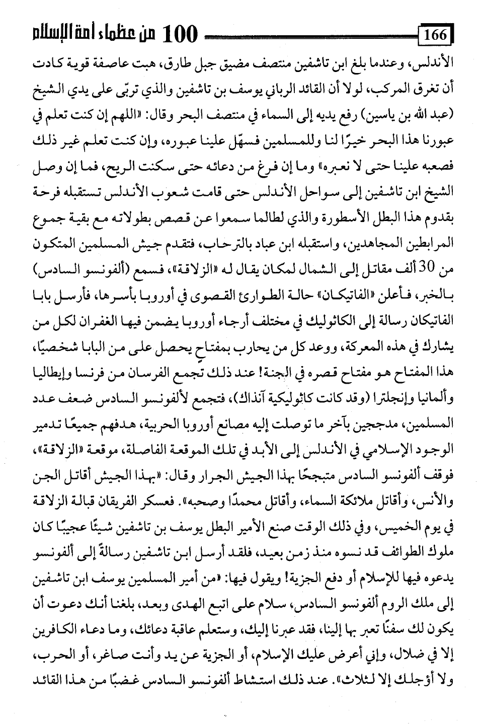 الأندلس، وعندما بلغ ابن تاشفين منتصف مضيق جبل طارق، هبت عاصفة قوية كادت أن تغرق المركب، لولا أن القائد الرباني يوسف بن تاشفين والذي تربّى على يدي الشيخ (عبد اللَّه بن ياسين) رفع يديه إلى السماء في منتصف البحر وقال: "اللهم إن كنت تعلم في عبورنا هذا البحر خيرًا لنا وللمسلمين فسهّل علينا عبوره، وإن كنت تعلم غير ذلك فصعبه علينا حتى لا نعبره" وما إن فرغ من دعائه حتى سكنت الريح، فما إن وصل الشيخ ابن تاشفين إلى سواحل الأندلس حتى قامت شعوب الأندلس تستقبله فرحة بقدوم هذا البطل الأسطورة والذي لطالما سمعوا عن قصص بطولاته مع بقية جموع المرابطين المجاهدين، واستقبله ابن عباد بالترحاب، فتقدم جيش المسلمين المتكون من 30 ألف مقاتل إلى الشمال لمكان يقال له "الزلاقة"، فسمع (ألفونسو السادس) بالخبر، فأعلن "الفاتيكان" حالة الطوارئ القصوى في أوروبا بأسرها، فأرسل بابا الفاتيكان رسالة إلى الكاثوليك في مختلف أرجاء أوروبا يضمن فيها الغفران لكل من يشارك في هذه المعركة، ووعد كل من يحارب بمفتاحٍ يحصل على من البابا شخصيًا، هذا المفتاح هو مفتاح قصره في الجنة! عند ذلك تجمع الفرسان من فرنسا وإيطاليا وألمانيا وإنجلترا (وقد كانت كاثوليكية آنذاك)، فتجمع لألفونسو السادس ضعف عدد المسلمين، مدججين بآخر ما توصلت إليه مصانع أوروبا الحربية، هدفهم جميعًا تدمير الوجود الإسلامي في الأندلس إلى الأبد في تلك الموقعة الفاصلة، موقعة "الزلاقة"، فوقف ألفونسو السادس متبجحًا بهذا الجيش الجرار وقال: "بهذا الجيش أقاتل الجن والأنس، وأقاتل ملائكة السماء، وأقاتل محمدًا وصحبه". فعسكر الفريقان قبالة الزلاقة في يوم الخميس، وفي ذلك الوقت صنع الأمير البطل يوسف بن تاشفين شيئًا عجيبًا كان ملوك الطوائف قد نسوه منذ زمن بعيد، فلقد أرسل ابن تاشفين رسالةً إلى ألفونسو يدعوه فيها للإسلام أو دفع الجزية! ويقول فيها: "من أمير المسلمين يوسف ابن تاشفين إلى ملك الروم ألفونسو السادس، سلام على اتبع الهدى وبعد، بلغنا أنك دعوت أن يكون لك سفنًا تعبر بها إلينا، فقد عبرنا إليك، وستعلم عاقبة دعائك، وما دعاء الكافرين إلا في ضلال، وإني أعرض عليك الإسلام، أو الجزية عن يد وأنت صاغر، أو الحرب، ولا أؤجلك إلا لثلاث". عند ذلك استشاط ألفونسو السادس غضبًا من هذا القائد