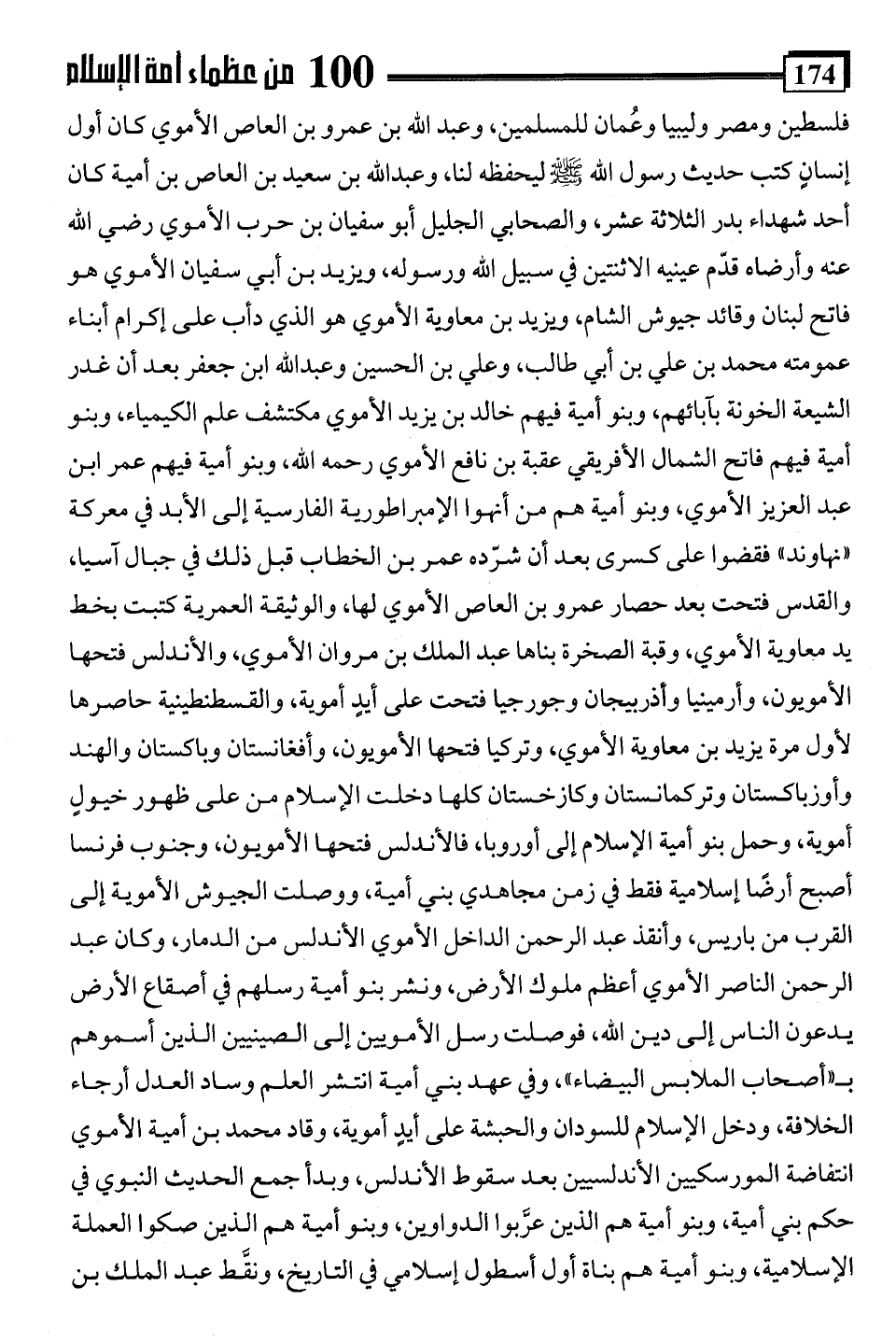 فلسطين ومصر وليبيا وعُمان للمسلمين، وعبد اللَّه بن عمرو بن العاص الأموي كان أول إنسانٍ كتب حديث رسول اللَّه -صلى اللَّه عليه وسلم- ليحفظه لنا، وعبد اللَّه بن سعيد بن العاص بن أمية كان أحد شهداء بدر الثلاثة عشر، والصحابي الجليل أبو سفيان بن حرب الأموي رضي اللَّه عنه وأرضاه قدّم عينيه الاثنتين في سبيل اللَّه ورسوله، ويزيد بن أبي سفيان الأموي هو فاتح لبنان وقائد جيوش الشام، ويزيد بن معاوية الأموي هو الذي دأب على إكرام أبناء عمومته محمد بن علي بن أبي طالب، وعلي بن الحسين وعبد اللَّه ابن جعفر بعد أن غدر الشيعة الخونة بآبائهم، وبنو أمية فيهم خالد بن يزيد الأموي مكتشف علم الكيمياء، وبنو أمية فيهم فاتح الشمال الأفريقي عقبة بن نافع الأموي رحمه اللَّه، وبنو أمية فيهم عمر بن عبد العزيز الأموي، وبنو أمية هم من أنهوا الإمبراطورية الفارسية إلى الأبد في معركة "نهاوند" فقضوا على كسرى بعد أن شرّده عمر بن الخطاب قبل ذلك في جبال آسيا، والقدس فتحت بعد حصار عمرو بن العاص الأموي لها، والوثيقة العمرية كتبت بخط يد معاوية الأموي، وقبة الصخرة بناها عبد الملك بن مروان الأموي، والأندلس فتحها الأمويون، وأرمينيا وأذربيجان وجورجيا فتحت على أيدٍ أموية، والقسطنطينية حاصرها لأول مرة يزيد بن معاوية الأموي، وتركيا فتحها الأمويون، وأفغانستان وباكستان والهند وأوزباكستان وتركمانستان وكازخستان كلها دخلت الإسلام من على ظهور خيولٍ أموية، وحمل بنو أمية الإسلام إلى أوروبا، فالأندلس فتحها الأمويون، وجنوب فرنسا أصبح أرضًا إسلامية فقط في زمن مجاهدي بني أمية، ووصلت الجيوش الأموية إلى القرب من باريس، وأنقذ عبد الرحمن الداخل الأموي الأندلس من الدمار، وكان عبد الرحمن الناصر الأموي أعظم ملوك الأرض، ونشر بنو أمية رسلهم في أصقاع الأرض يدعون الناس إلى دين اللَّه، فوصلت رسل الأمويين إلى الصينيين الذين أسموهم بـ "أصحاب الملابس البيضاء"، وفي عهد بني أمية انتشر العلم وساد العدل أرجاء الخلافة، ودخل الإسلام للسودان والحبشة على أيدٍ أموية، وقاد محمد بن أمية الأموي انتفاضة المورسكيين الأندلسيين بعد سقوط الأندلس، وبدأ جمع الحديث النبوي في حكم بني أمية، وبنو أمية هم الذين عرَّبوا الدواوين، وبنو أمية هم الذين صكوا العملة الإسلامية، وبنو أمية هم بناة أول أسطول إسلامي في التاريخ، ونقَّط عبد الملك بن