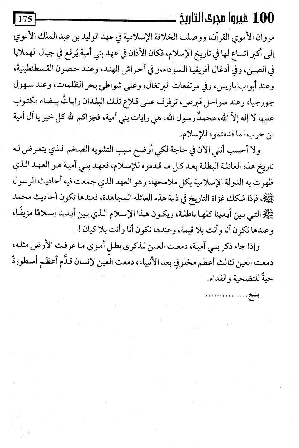 مروان الأموي القرآن، ووصلت الخلافة الإسلامية في عهد الوليد بن عبد الملك الأموي إلى أكبر اتساع لها في تاريخ الإسلام، فكان الأذان في عهد بني أمية يُرفع في جبال الهملايا في الصين، وفي أدغال أفريقيا السوداء، وفي أحراش الهند، وعند حصون القسطنطينية، وعند أبواب باريس، وفي مرتفعات البرتغال، وعلى شواطئ بحر الظلمات، وعند سهول جورجيا، وعند سواحل قبرص، ترفرف على قلاع تلك البلدان راياتٌ بيضاء مكتوب عليها لا إله إلّا اللَّه، محمدٌ رسول اللَّه، هي رايات بني أمية، فجزاكم اللَّه كل خير يا آل أمية بن حرب لما قدمتموه للإسلام.
