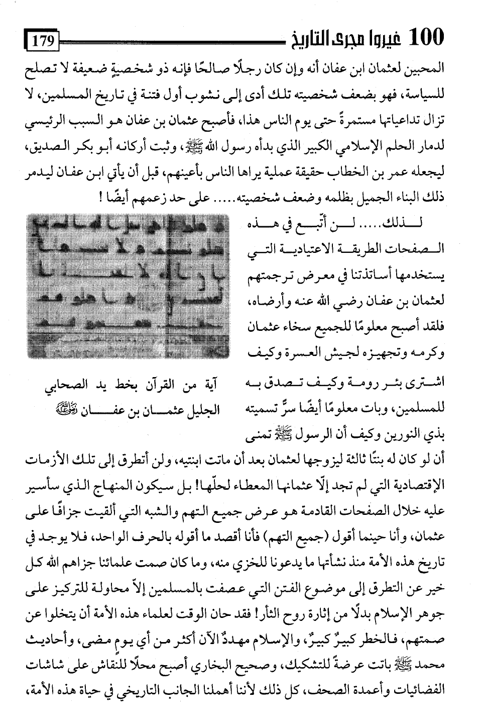 لذلك. . . . لن أتبع في هذه الصفحات الطريقة الاعتيادية التي يستخدمها أساتذتنا في معرض ترجمتهم لعثمان بن عفان -رضي اللَّه عنه- وأرضاه، فلقد أصبح معلومًا للجميع سخاء عثمان وكرمه وتجهيزه لجيش العسرة وكيف اشترى بئر رومة وكيف تصدق به للمسلمين، وبات معلومًا أيضًا سر تسميته بذي النورين وكيف أن الرسول -صلى اللَّه عليه وسلم- تمنى أن لو كان له بنتًا ثالثة ليزوجها لعثمان بعد أن ماتت ابنته، ولن أتطرق إلى تلك الأزمات الإقتصادية التي لم تجد إلّا عثمانها المعطاء لحلها! بل سيكون المنهاج الذي سأسير عليه خلال الصفحات القادمة هو عرض جميع التهم والشبه التي ألقيت جزافًا على عثمان، وأنا حينما أقول (جميع التهم) فأنا أقصد ما أقوله بالحرف الواحد، فلا يوجد في تاريخ هذه الأمة منذ نشأتها ما يدعونا للخزي منه، وما كان صمت علمائنا جزاهم اللَّه كل خير عن التطرق إلى موضوع الفتنة التي عصفت بالمسلمين إلّا محاولة التركيز على جوهر الإسلام بدلًا من إثارة روح الثأر! فقد حان الوقت لعلماء هذه الأمة أن يتخلو عن صمتهم، فالخطر كبيرٌ كبيرٌ، والإسلام مهددٌ الآن أكثر من أي يومٍ مضى، وأحاديث محمد -صلى اللَّه عليه وسلم- باتت عرضةً للتشكيك، وصحيح البخاري أصبح محلًا للنقاش على شاشات الفضائيات وأعمدة الصحف، كل ذلك لأننا أهملنا الجانب التاريخي في حياة هذه الأمة،