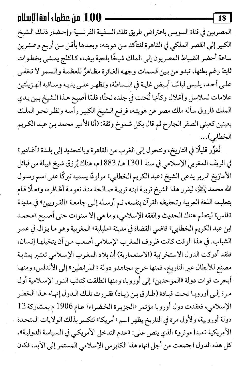 المصريين في قناة السويس باعتراض طريق تلك السفينة الفرنسية وإحضار ذلك الشيخ الكبير إلى القصر الملكي في القاهرة للتأكد من هويته، وبعدها بأقل من أربع وعشرين ساعة أحضر الضباط المصريون إلى الملك شيخًا بلحية بيضاء كالثلج يمشي بخطوات ثابتة رغم بطئها، تبدو من بين قسمات وجهه الغائرة مظاهرٌ للعظمة والسمو لا تخفى على أحد، يلبس لباسًا أبيض غاية في البساطة، وتظهر على يديه وساقيه الهزيلتين علامات لسلاسل وأعلال وكأنها نُحتت في جلده نحتًا، فلمّا أصبح هذا الشيخ بين يدي الملك فاروق سأله ملك مصر عن هويته، فرفع الشيخ الكبير رأسه ونظر نحو الملك بعينين كعيني الصقر الجارح ثم قال بكل شموخ وثقة: (أنا الأمير محمد بن عبد الكريم الخطابي). . .