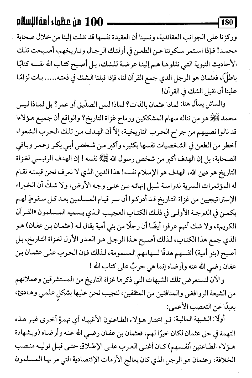 وركزنا على الجوانب العقائدية، ونسينا أن العقيدة نفسها قد نقلت إلينا من خلال صحابة محمد! فإذا استمر سكوتنا عن الطعن في أولئك الرجال وتاريخهم، أصبحت تلك الأحاديث النبوية التي نقلوها هم إلينا عرضة للشك، بل أصبح كتاب اللَّه نفسه كتابًا باطلًا، فعثمان هو الرجل الذي جمع القرآن لنا، فإذا قبلنا الشك في ذمته. . . . بات لزامًا علينا أن نقبل الشك في القرآن!