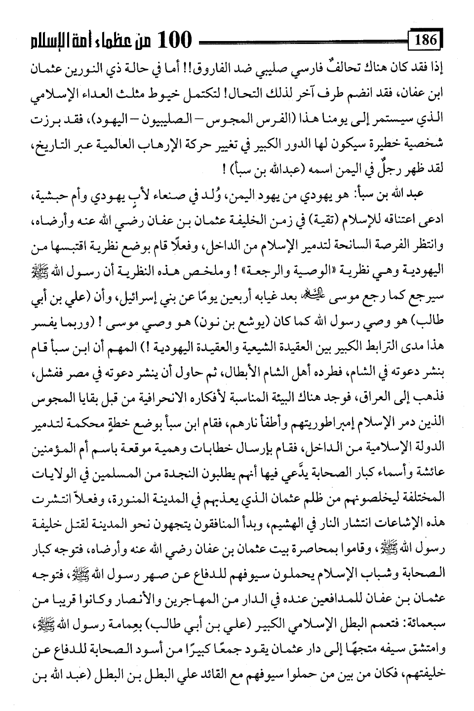 عبد اللَّه بن سبأ: هو يهودي من يهود اليمن، وُلد في صنعاء لأبٍ يهودي وأم حبشية، ادعى اعتناقه للإسلام (تقية) في زمن الخليفة عثمان بن عفان رضي اللَّه عنه وأرضاه، وانتظر الفرصة السانحة لتدمير الإسلام من الداخل، وفعلًا قام بوضع نظرية اقتبسها من اليهودية وهي نظرية "الوصية والرجعة"! وملخص هذه النظرية أن رسول اللَّه -صلى اللَّه عليه وسلم- سيرجع كما رجع موسى -عليه السلام- بعد غيابه أربعين يومًا عن بني إسرائيل، وأن (علي بن أبي طالب) هو وصي رسول اللَّه كما كان (يوشع بن نون) هو وصي موسى! (وربما يفسر هذا مدى الترابط الكبير بين العقيدة الشيعية والعقيدة اليهودية!) المهم أن ابن سبأ قام بنشر دعوته في الشام، فطرده أهل الشام الأبطال، ثم حاول أن ينشر دعوته في مصر ففشل، فذهب إلى العراق، فوجد هناك البيئة المناسبة لأفكاره الانحرافية من قبل بقايا المجوس الذين دمر الإسلام إمبراطوريتهم وأطفأ نارهم، فقام ابن سبأ بوضع خطةٍ محكمة لتدمير الدولة الإسلامية من الداخل، فقام بإرسال خطابات وهمية موقعة باسم أم المؤمنين عائشة وأسماء كبار الصحابة يدَّعي فيها أنهم يطلبون النجدة من المسلمين في الولايات المختلفة ليخلصونهم من ظلم عثمان الذي يعذبهم في المدينة المنورة، وفعلاّ انتشرت هذه الإشاعات انتشار النار في الهشيم، وبدأ المنافقون يتجهون نحو المدينة لقتل خليفة رسول اللَّه -صلى اللَّه عليه وسلم-، وقاموا بمحاصرة بيت عثمان بن عفان رضي اللَّه عنه وأرضاه، فتوجه كبار الصحابة وشباب الإسلام يحملون سيوفهم للدفاع عن صهر رسول اللَّه -صلى اللَّه عليه وسلم-، فتوجه عثمان بن عفان للمدافعين عنده في الدار من المهاجرين والأنصار وكانوا قريبا من سبعمائة: فتعمم البطل الإسلامي الكبير (علي بن أبي طالب) بعِمامة رسول اللَّه -صلى اللَّه عليه وسلم-، وامتشق سيفه متجهًا إلى دار عثمان يقود جمعًا كبيرًا من أسود الصحابة للدفاع عن خليفتهم، فكان من بين من حملوا سيوفهم مع القائد علي البطل بن البطل (عبد اللَّه بن
