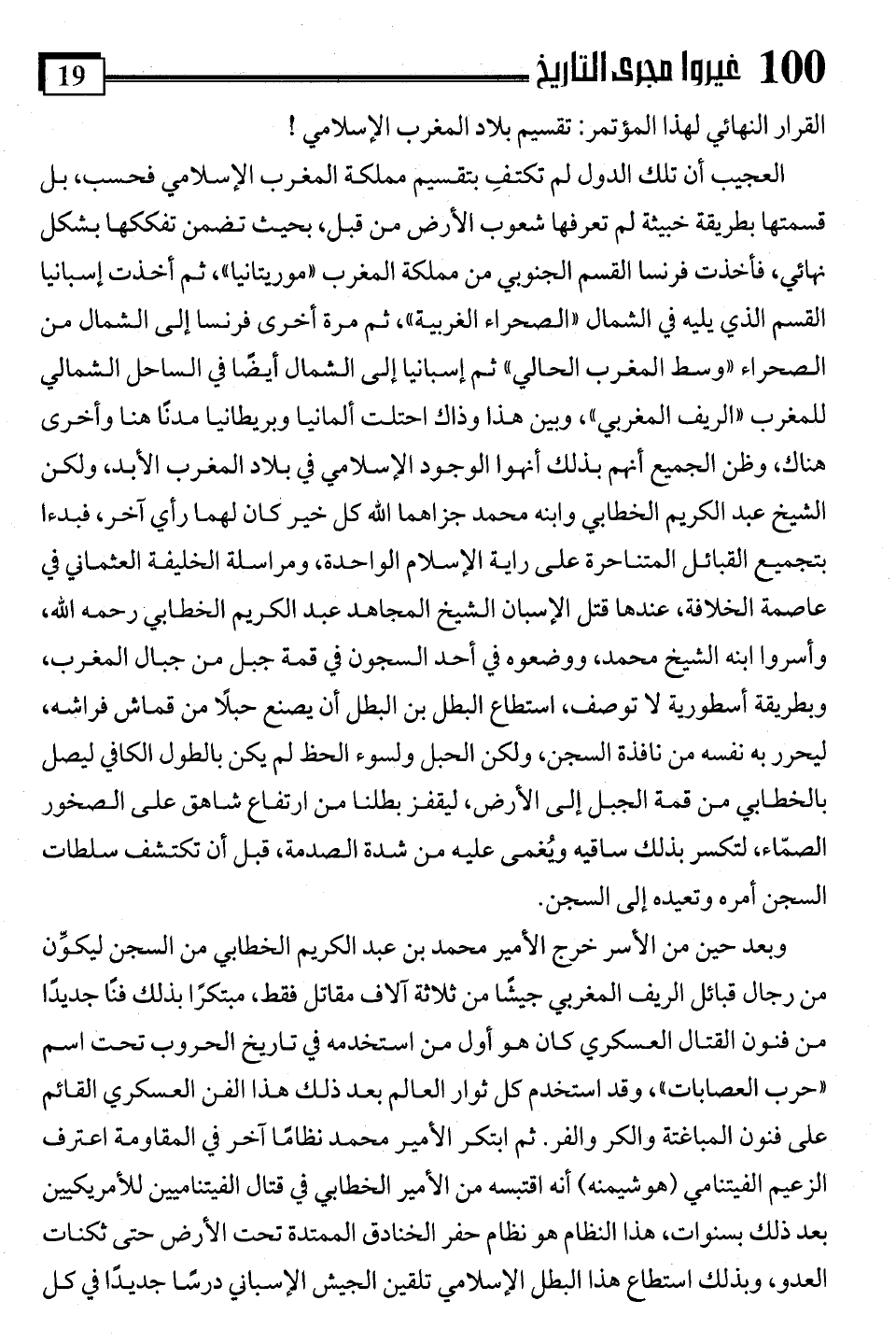العجيب أن تلك الدول لم تكتفِ بتقسيم مملكة المغرب الإسلامي فحسب، بل قسمتها بطريقة خبيثة لم تعرفها شعوب الأرض من قبل، بحيث تضمن تفككها بشكل نهائي، فأخذت فرنسا القسم الجنوبي من مملكة المغرب "موريتانيا"، ثم أخذت إسبانيا القسم الذي يليه في الشمال "الصحراء الغربية"، ثم مرة أخرى فرنسا إلى الشمال من الصحراء "وسط المغرب الحالي" ثم إسبانيا إلى الشمال أيضًا في الساحل الشمالي للمغرب "الريف المغربي"، وبين هذا وذاك احتلت ألمانيا وبريطانيا مدنًا هنا وأخرى هناك، وظن الجميع أنهم بذلك أنهوا الوجود الإسلامي في بلاد المغرب الأبد، ولكن الشيخ عبد الكريم الخطابي وابنه محمد جزاهما اللَّه كل خير كان لهما رأي آخر، فبدءا بتجميع القبائل المتناحرة على راية الإسلام الواحدة، ومراسلة الخليفة العثماني في عاصمة الخلافة، عندها قتل الإسبان الشيخ المجاهد عبد الكريم الخطابي رحمه اللَّه، وأسروا ابنه الشيخ محمد، ووضعوه في أحد السجون في قمة جبل من جبال المغرب، وبطريقة أسطورية لا توصف، استطاع البطل بن البطل أن يصنع حبلًا من قماش فراشه، ليحرر به نفسه من نافذة السجن، ولكن الحبل ولسوء الحظ لم يكن بالطول الكافي ليصل بالخطابي من قمة الجبل إلى الأرض، ليقفز بطلنا من ارتفاع شاهق على الصخور الصمّاء، لتكسر بذلك ساقيه ويُغمى عليه من شدة الصدمة، قبل أن تكتشف سلطات السجن أمره وتعيده إلى السجن.