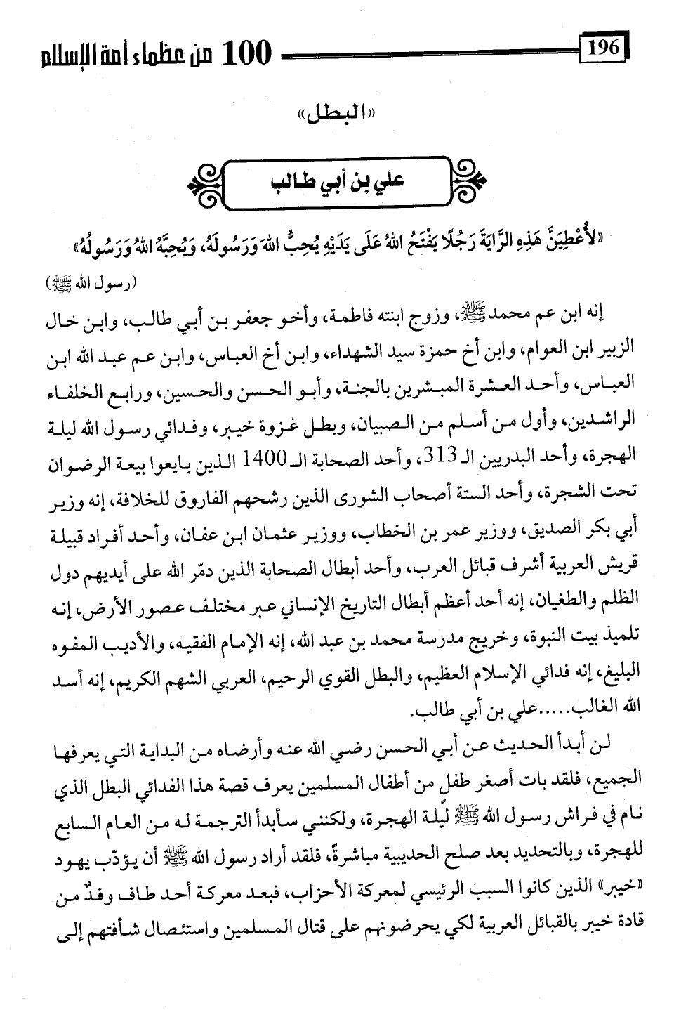 إنه ابن عم محمد -صلى اللَّه عليه وسلم-، وزوج ابنته فاطمة، وأخو جعفر بن أبي طالب، وابن خال الزبير ابن العوام، وابن أخ حمزة سيد الشهداء، وابن أخ العباس، وابن عم عبد اللَّه ابن العباس، وأحد العشرة المبشرين بالجنة، وأبو الحسن والحسين، ورابع الخلفاء الراشدين، وأول من أسلم من الصبيان، وبطل غزوة خيبر، وفدائي رسول اللَّه ليلة الهجرة، وأحد البدريين الـ 313، وأحد الصحابة الى 1400 الذين بايعوا بيعة الرضوان تحت الشجرة، وأحد الستة أصحاب الشورى الذين رشحهم الفاروق للخلافة، إنه وزير أبي بكر الصديق، ووزير عمر بن الخطاب، ووزير عثمان ابن عفان، وأحد أفراد قبيلة قريش العربية أشرف قبائل العرب، وأحد أبطال الصحابة الذين دمّر اللَّه على أيديهم دول الظلم والطغيان، إنه أحد أعظم أبطال التاريخ الإنساني عبر مختلف عصور الأرض، إنه تلميذ بيت النبوة، وخريج مدرسة محمد بن عبد اللَّه، إنه الإمام الفقيه، والأديب المفوه البليغ، إنه فدائي الإسلام العظيم، والبطل القوي الرحيم، العربي الشهم الكريم، إنه أسد اللَّه الغالب. . . . علي بن أبي طالب.