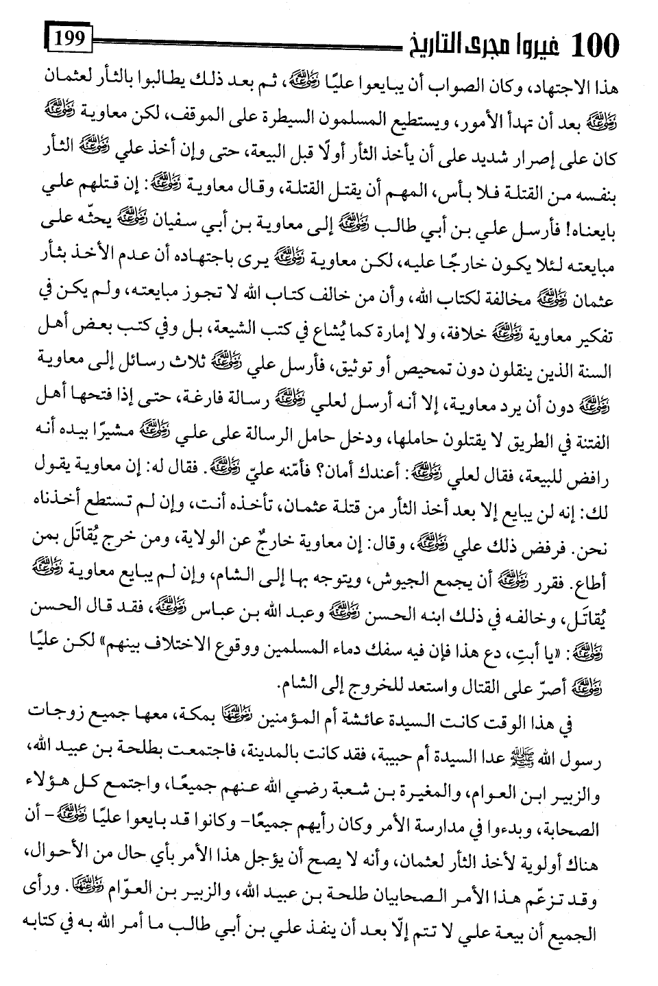 هذا الاجتهاد، وكان الصواب أن يبايعوا عليًا -رضي اللَّه عنه-، ثم بعد ذلك يطالبوا بالثأر لعثمان -رضي اللَّه عنه- بعد أن تهدأ الأمور، ويستطيع المسلمون السيطرة على الموقف، لكن معاوية -رضي اللَّه عنه- كان على إصرار شديد على أن يأخذ الثأر أولًا قبل البيعة، حتى وإن أخذ علي -رضي اللَّه عنه-. الثأر بنفسه من القتلة فلا بأس، المهم أن يقتل القتلة، وقال معاوية -رضي اللَّه عنه-: إن قتلهم علي بايعناه! فأرسل علي بن أبي طالب -رضي اللَّه عنه- إلى معاوية بن أبي سفيان -رضي اللَّه عنه-. يحثّه على مبايعته لئلا يكون خارجًا عليه، لكن معاوية -رضي اللَّه عنه- يرى باجتهاده أن عدم الأخذ بثأر عثمان -رضي اللَّه عنه- مخالفة لكتاب اللَّه، وأن من خالف كتاب اللَّه لا تجوز مبايعته، ولم يكن في تفكير معاوية -رضي اللَّه عنه- خلافة، ولا إمارة كما يُشاع في كتب الشيعة، بل وفي كتب بعض أهل السنة الذين ينقلون دون تمحيص أو توثيق، فأرسل علي -رضي اللَّه عنه- ثلاث رسائل إلى معاوية -رضي اللَّه عنه- دون أن يرد معاوية، إلا أنه أرسل لعلي -رضي اللَّه عنه- رسالة فارغة، حتى إذا فتحها أهل الفتنة في الطريق لا يقتلون حاملها، ودخل حامل الرسالة على علي -رضي اللَّه عنه- مشيرًا بيده أنه رافض للبيعة، فقال لعلي -رضي اللَّه عنه-: أعندك أمان؟ فأمّنه عليّ -رضي اللَّه عنه-. فقال له: إن معاوية يقول لك: إنه لن يبايع إلا بعد أخذ الثأر من قتلة عثمان، تأخذه أنت، وإن لم تستطع أخذناه نحن. فرفض ذلك علي -رضي اللَّه عنه-، وقال: إن معاوية خارجٌ عن الولاية، ومن خرج يُقاتَل بمن أطاع. فقرر -رضي اللَّه عنه- أن يجمع الجيوش، ويتوجه بها إلى الشام، وإن لم يبايع معاوية -رضي اللَّه عنه- يُقاتَل، وخالفه في ذلك ابنه الحسن -رضي اللَّه عنه- وعبد اللَّه بن عباس -رضي اللَّه عنه-، فقد قال الحسن -رضي اللَّه عنه-: "يا أبتِ، دع هذا فإن فيه سفك دماء المسلمين ووقوع الاختلاف بينهم" لكن عليًا -رضي اللَّه عنه- أصرّ على القتال واستعد للخروج إلى الشام.