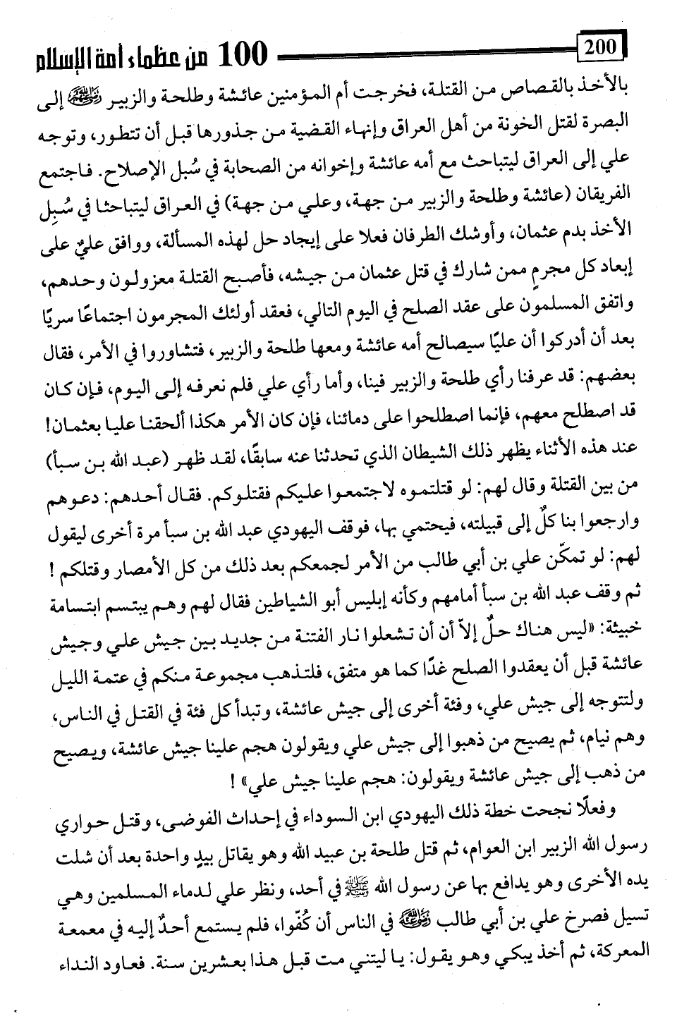 وفعلًا نجحت خطة ذلك اليهودي ابن السوداء في إحداث الفوضى، وقتل حواري رسول اللَّه الزبير ابن العوام، ثم قتل طلحة بن عبيد اللَّه وهو يقاتل بيدٍ واحدة بعد أن شلت يده الأخرى وهو يدافع بها عن رسول اللَّه -صلى اللَّه عليه وسلم- في أحد، ونظر علي لدماء المسلمين وهي تسيل فصرخ علي بن أبي طالب -رضي اللَّه عنه- في الناس أن كُفّوا، فلم يستمع أحدٌ إليه في معمعة المعركة، ثم أخذ يبكي وهو يقول: يا ليتني مت قبل هذا بعشرين سنة. فعاود النداء