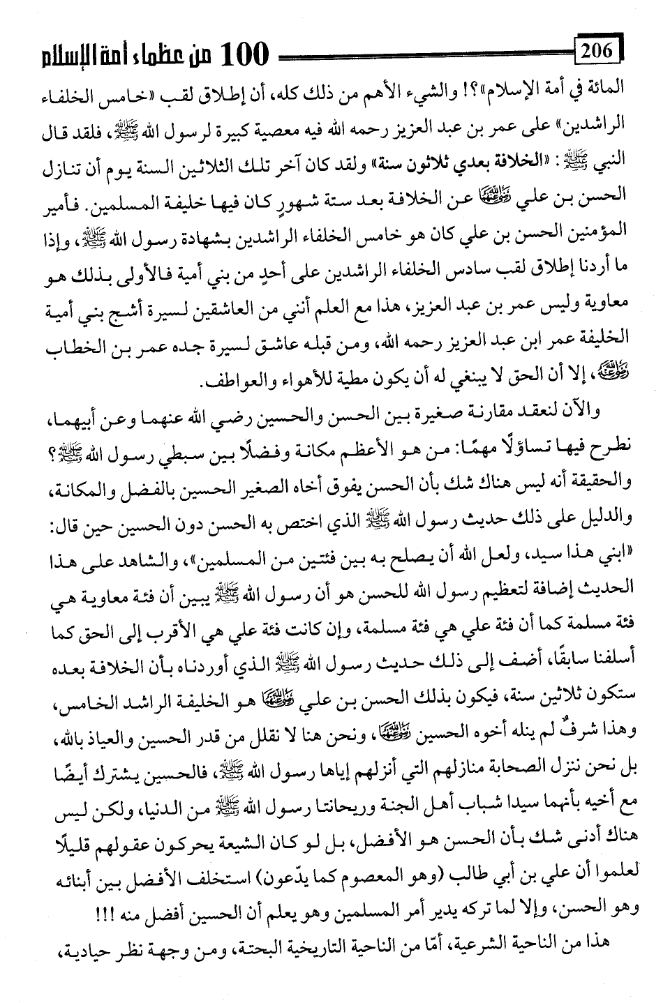 المائة في أمة الإِسلام"؟! والشيء الأهم من ذلك كله، أن إطلاق لقب "خامس الخلفاء الراشدين" على عمر بن عبد العزيز رحمه اللَّه فيه معصية كبيرة لرسول اللَّه -صلى اللَّه عليه وسلم-، فلقد قال النبي -صلى اللَّه عليه وسلم-: "الخلافة بعدي ثلاثون سنة" ولقد كان آخر تلك الثلاثين السنة يوم أن تنازل الحسن بن علي -رضي اللَّه عنهما- عن الخلافة بعد ستة شهوو كان فيها خليفة المسلمين. فأمير المؤمنين الحسن بن علي كان هو خامس الخلفاء الراشدين بشهادة رسول اللَّه -صلى اللَّه عليه وسلم-، وإذا ما أردنا إطلاق لقب سادس الخلفاء الراشدين على أحدٍ من بني أمية فالأولى بذلك هو معاوية وليس عمر بن عبد العزيز، هذا مع العلم أنني من العاشقين لسيرة أشج بني أمية الخليفة عمر ابن عبد العزيز رحمه اللَّه، ومن قبله عاشق لسيرة جده عمر بن الخطاب -رضي اللَّه عنه-، إلا أن الحق لا يبنغي له أن يكون مطية للأهواء والعواطف.
