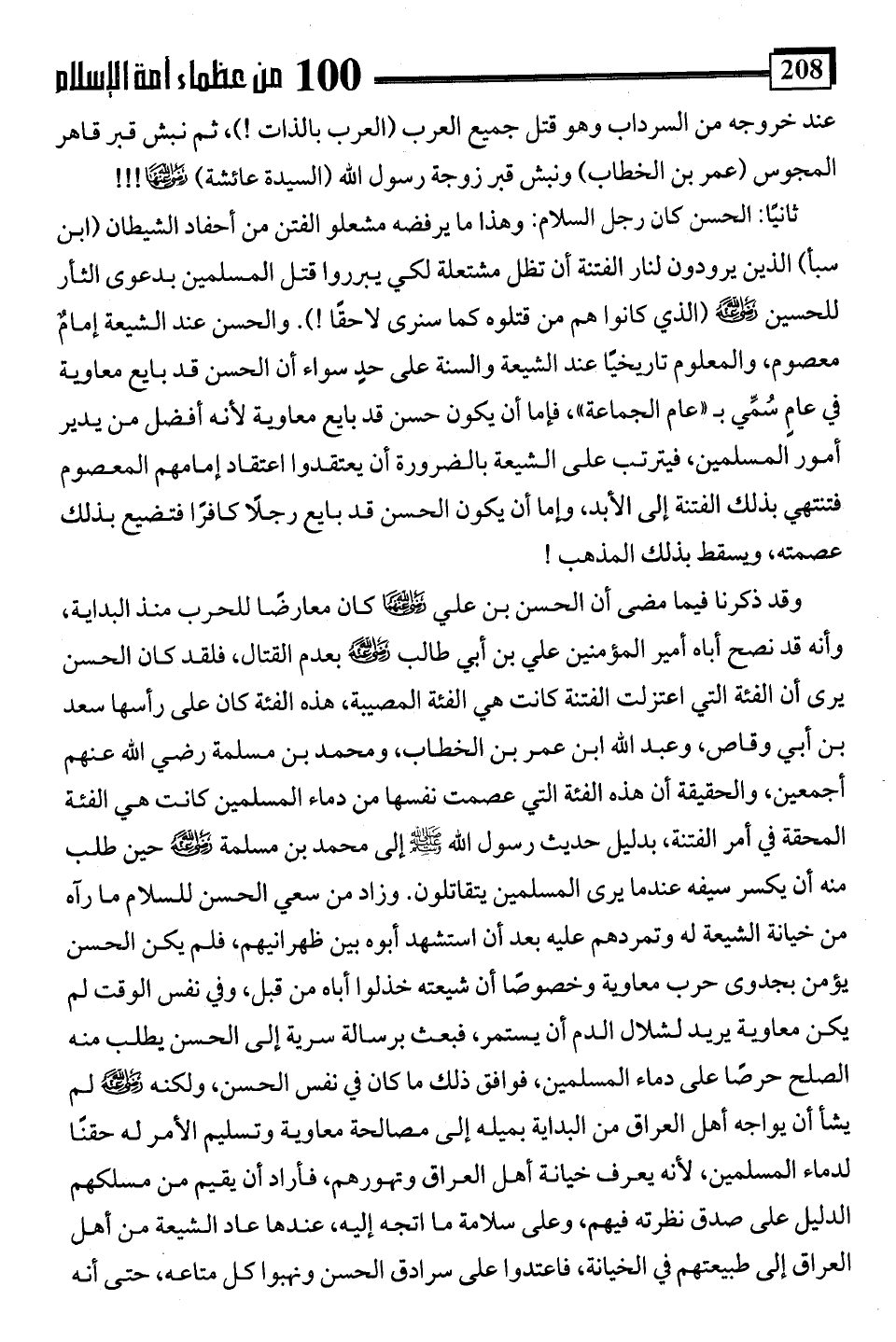 ثانيًا: الحسن كان رجل السلام: وهذا ما يرفضه مشعلو الفتن من أحفاد الشيطان (ابن سبأ) الذين يرودون لنار الفتنة أن تظل مشتعلة لكي يبرروا قتل المسلمين بدعوى الثأر للحسين -رضي اللَّه عنه- (الذي كانوا هم من قتلوه كما سنرى لاحقًا!). والحسن عند الشيعة إمامٌ معصوم، والمعلوم تاريخيًا عند الشيعة والسنة على حدٍ سواء أن الحسن قد بايع معاوية في عام سُمِّي بـ "عام الجماعة"، فإما أن يكون حسن قد بايع معاوية لأنه أفضل من يدير أمور المسلمين، فيترتب على الشيعة بالضرورة أن يعتقدوا اعتقاد إمامهم المعصوم فتنتهي بذلك الفتنة إلى الأبد، وإما أن يكون الحسن قد بايع رجلًا كافرًا فتضيع بذلك عصمته، ويسقط بذلك المذهب!