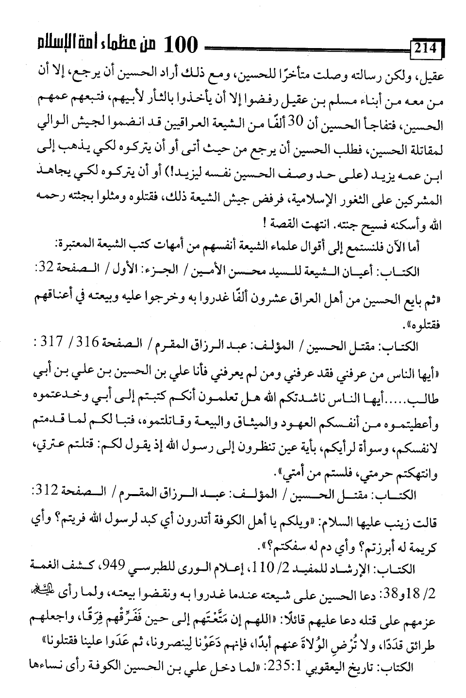 عقيل، ولكن رسالته وصلت متأخرًا للحسين، ومع ذلك أراد الحسين أن يرجع، إلا أن من معه من أبناء مسلم بن عقيل رفضوا إلا أن يأخذوا بالثأر لأبيهم، فتبعهم عمهم الحسين، فتفاجأ الحسين أن 30 ألفًا من الشيعة العراقيين قد انضموا لجيش الوالي لمقاتلة الحسين، فطلب الحسين أن يرجع من حيث أتى أو أن يتركوه لكي يذهب إلى ابن عمه يزيد (على حد وصف الحسين نفسه ليزيد!) أو أن يتركوه لكي يجاهد المشركين على الثغور الإِسلامية، فرفض جيش الشيعة ذلك، فقتلوه ومثلوا بجثته رحمه اللَّه وأسكنه فسيح جنته. انتهت القصة!