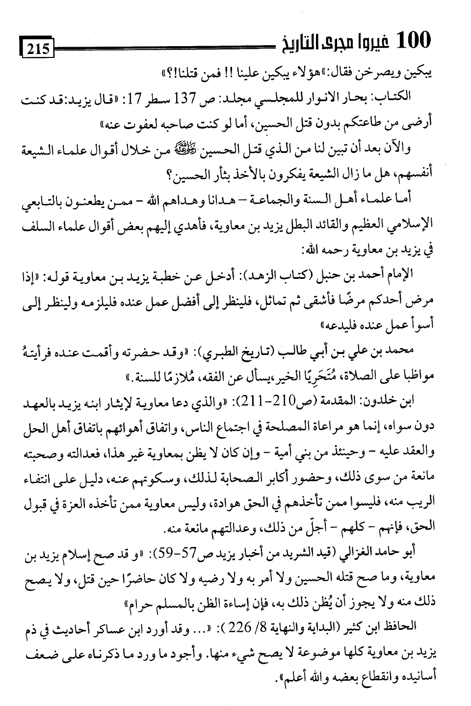 الكتاب: بحار الأنوار للمجلسي مجدلى: عمر 137 سطر 17: "قال يزيد: قد كنت أرضى من طاعتكم بدون قتل الحسين، أما لو كنت صاحبه لعفوت عنه".
