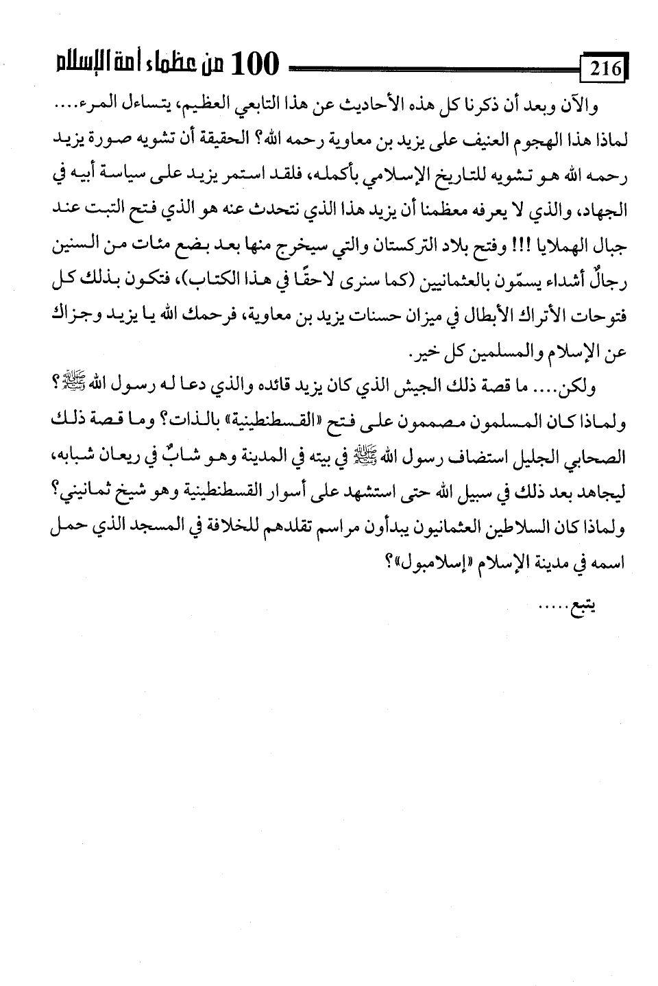 والآن وبعد أن ذكرنا كل هذه الأحاديث عن هذا التابعي العظيم، يتساءل المرء. . . . لماذا هذا الهجوم العنيف على يزيد بن معاوية رحمه اللَّه؟ الحقيقة أن تشويه صورة يزيد رحمه اللَّه هو تشويه للتاريخ الإِسلامي بأكمله، فلقد استمر يزيد على سياسة أبيه في الجهاد، والذي لا يعرفه معظمنا أن يزيد هذا الذي نتحدث عنه هو الذي فتح التبت عند جبال الهملايا!!! وفتح بلاد التركستان والتي سيخرج منها بعد بضع مئات من السنين رجالٌ أشداء يسمّون بالعثمانيين (كما سنرى لاحقا في هذا الكتاب)، فتكون بذلك كل فتوحات الأتراك الأبطال في ميزان حسنات يزيد بن معاوية، فرحمك اللَّه يا يزيد وجزاك عن الإِسلام والمسلمين كل خير.