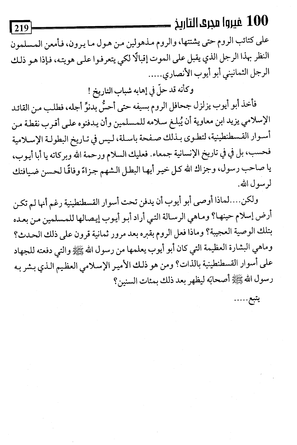 على كتائب الروم حتى يشتتها، والروم مذهولين من قوله ما يرون، فأمعن المسلمون النظر بهذا الرجل الذي يقبل على الموت إقبالًا لكي يتعرفوا على هويته، فإذا هو ذلك الرجل الثمانيني أبو أيوب الأنصاري. . . .