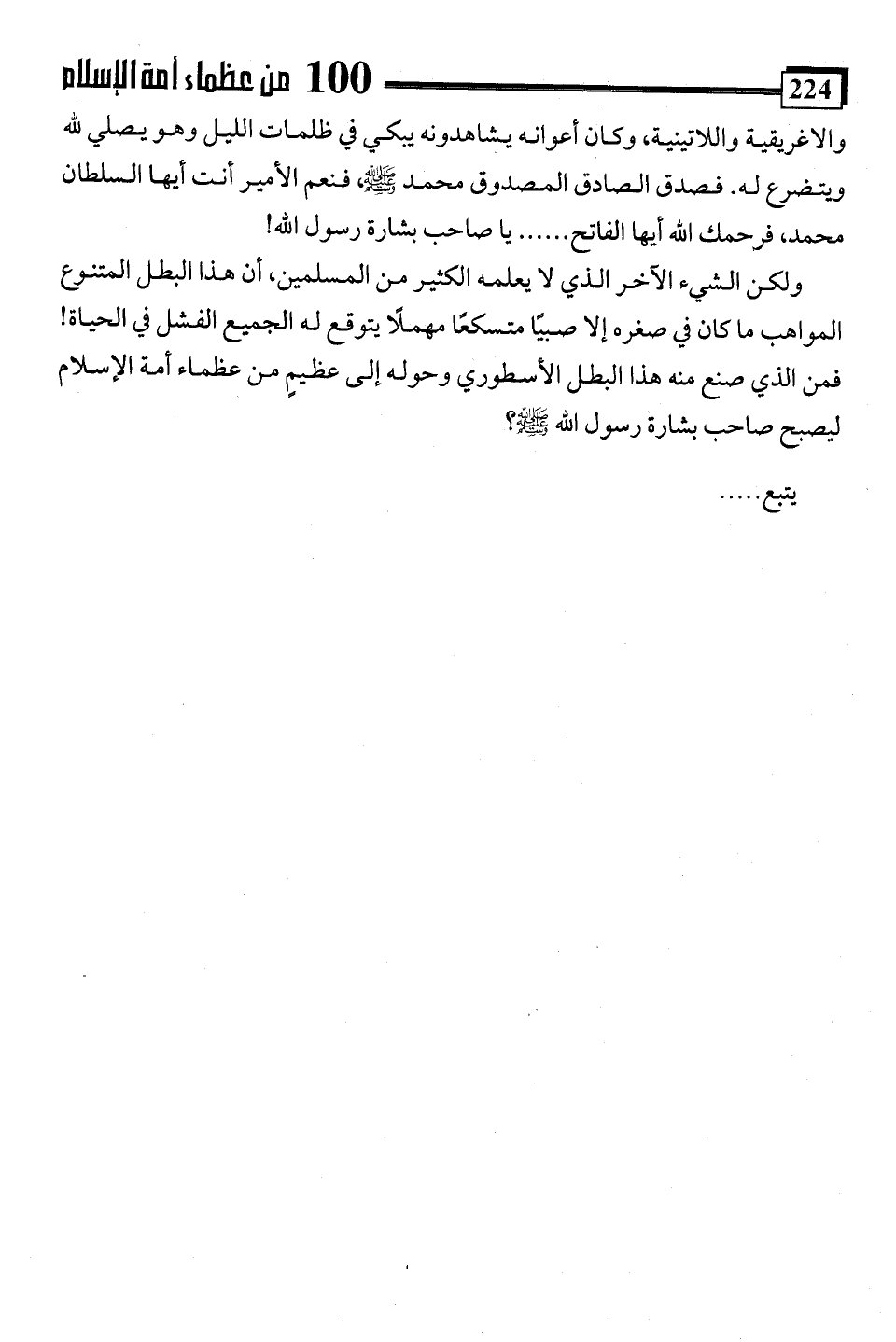 والاغريقية واللاتينية، وكان أعوانه يشاهدونه يبكي في ظلمات الليل وهو يصلي للَّه ويتضرع له. فصدق الصادق المصدوق محمَّد -صلى اللَّه عليه وسلم-، فنعم الأمير أنت أيها السلطان محمَّد، فرحمك اللَّه أيها الفاتح. . . . . يا صاحب بشارة رسول اللَّه!